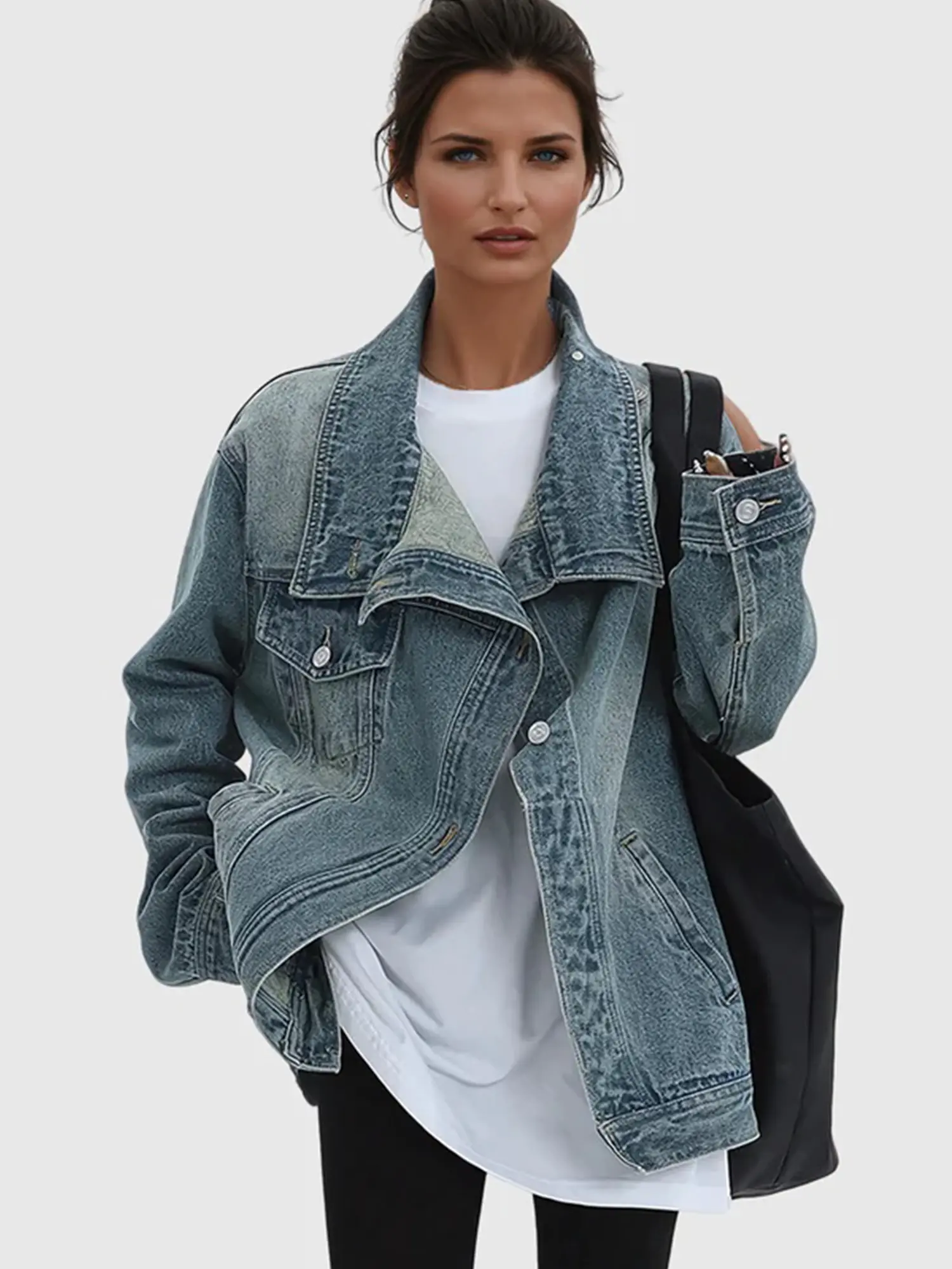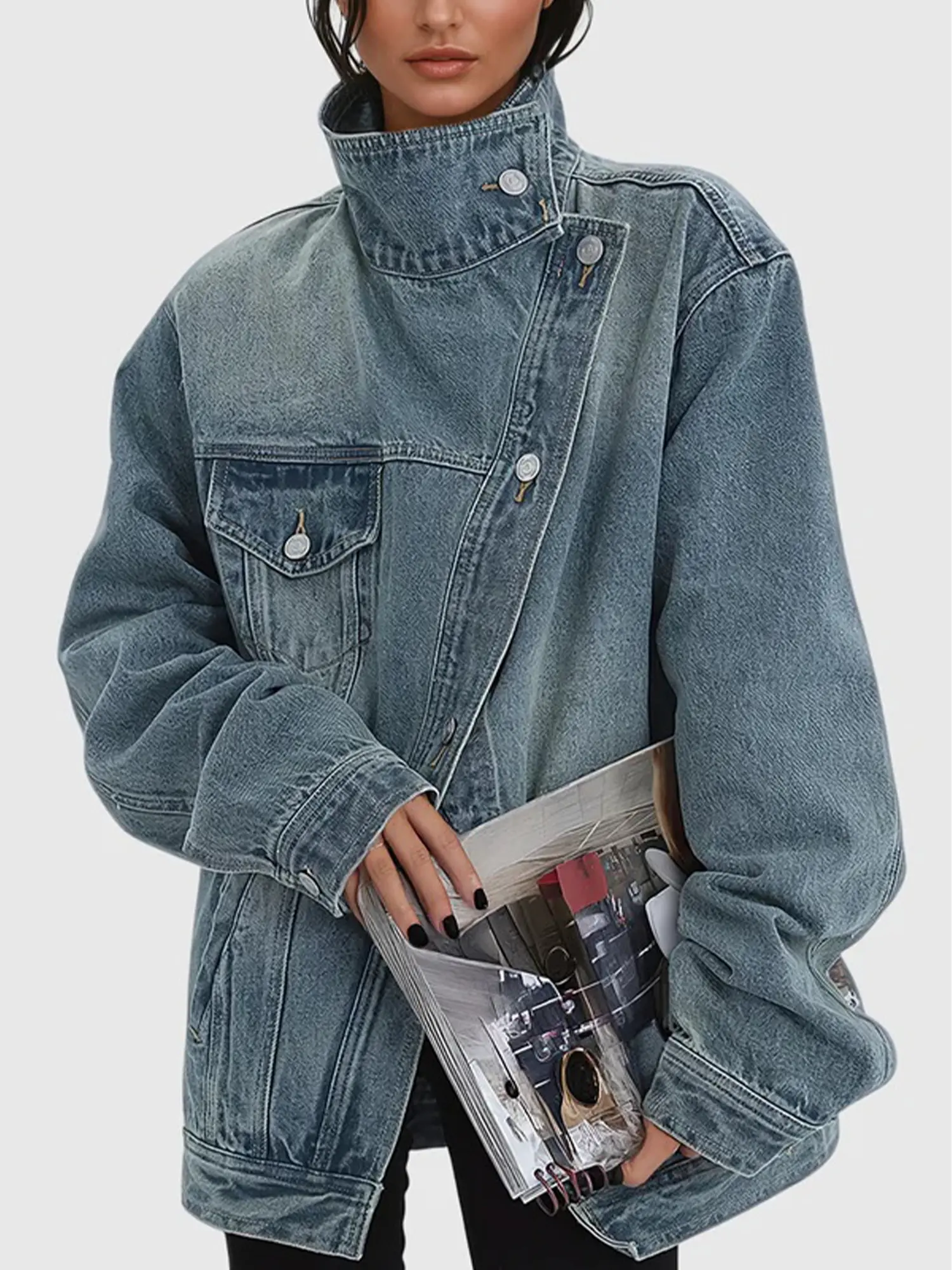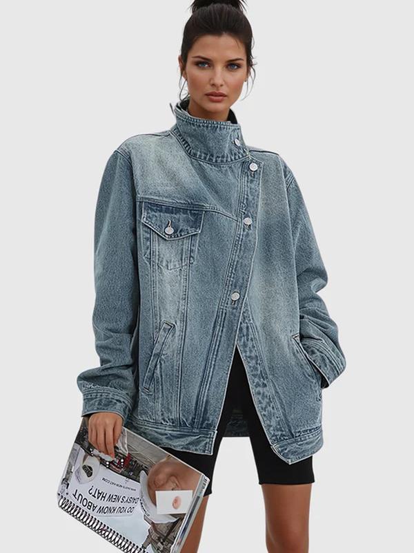 🌟 Women's Vintage Washed High Neck Asymmetric Button Loose Denim Jacket 🌟