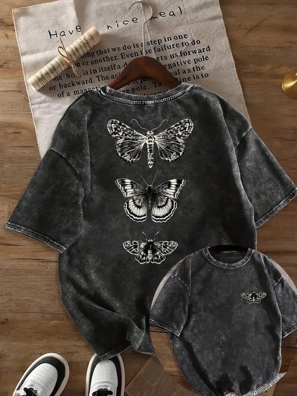 Women's Vintage Washed T-Shirt with Butterfly Print - Thick Soft Fabric, Loose Fit Round Neck Short Sleeve, Light Grey & Black Casual Summer Top, Machine Washable Everyday Tee Valentine's Day gift hooded sweatshirt festival gift round-neck sweatshirt
