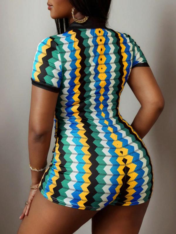 Women's Wave Striped Print Romper, Street Fashion Casual Fitted Short Sleeve Romper for Daily Outdoor Wear, Ladies Clothes for Summer, Womenswear, Streetwear, Streetwear Jumpsuits