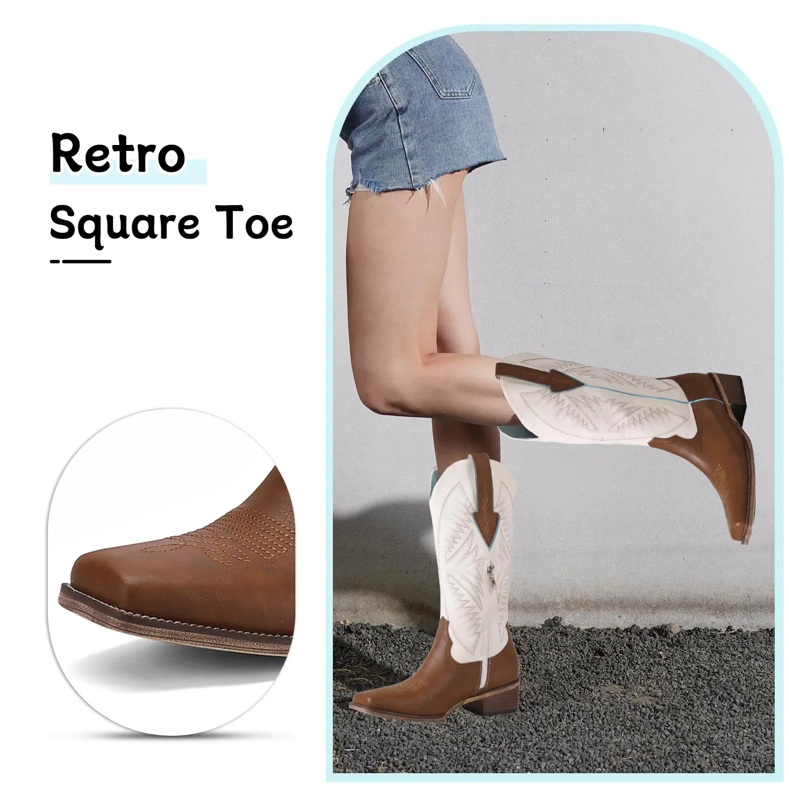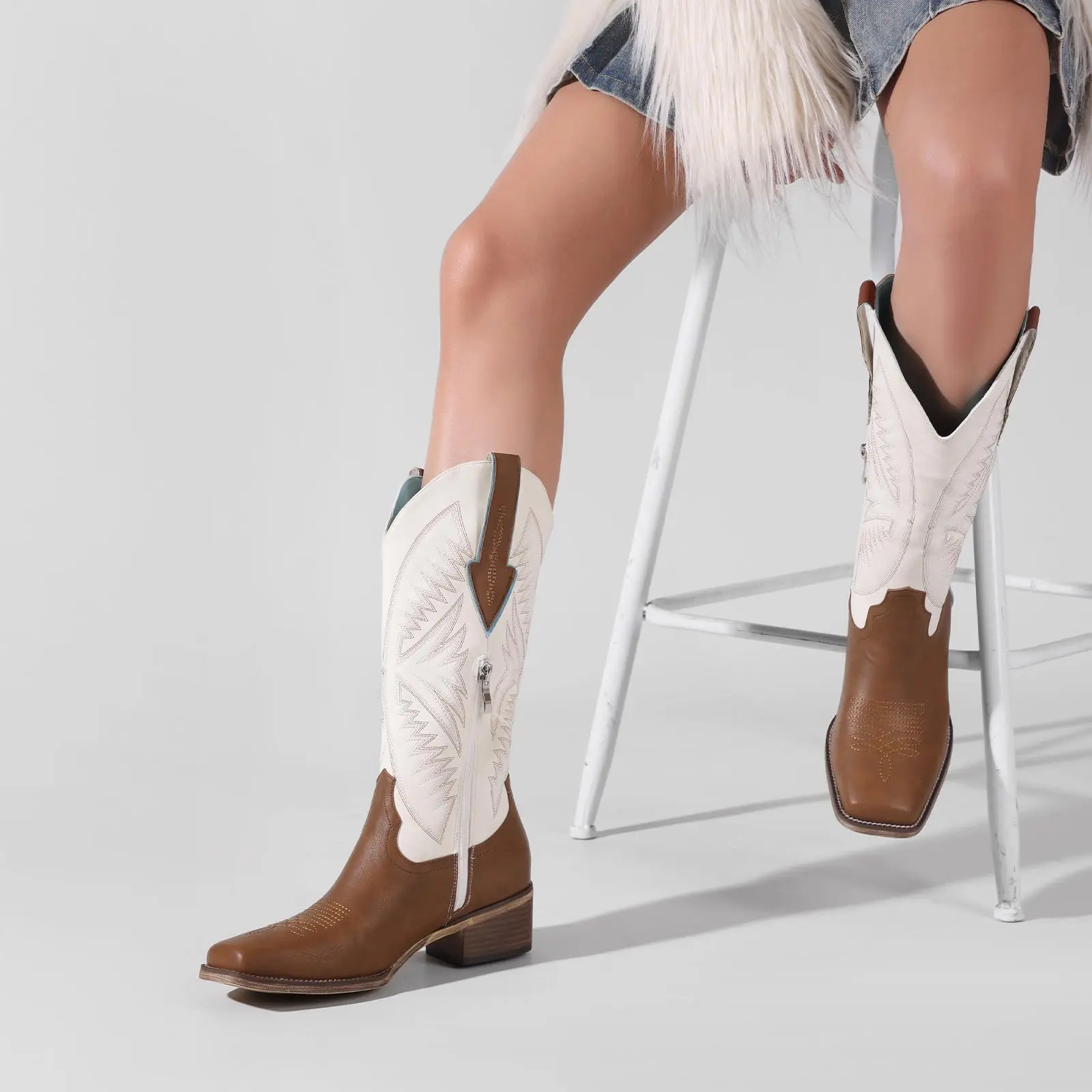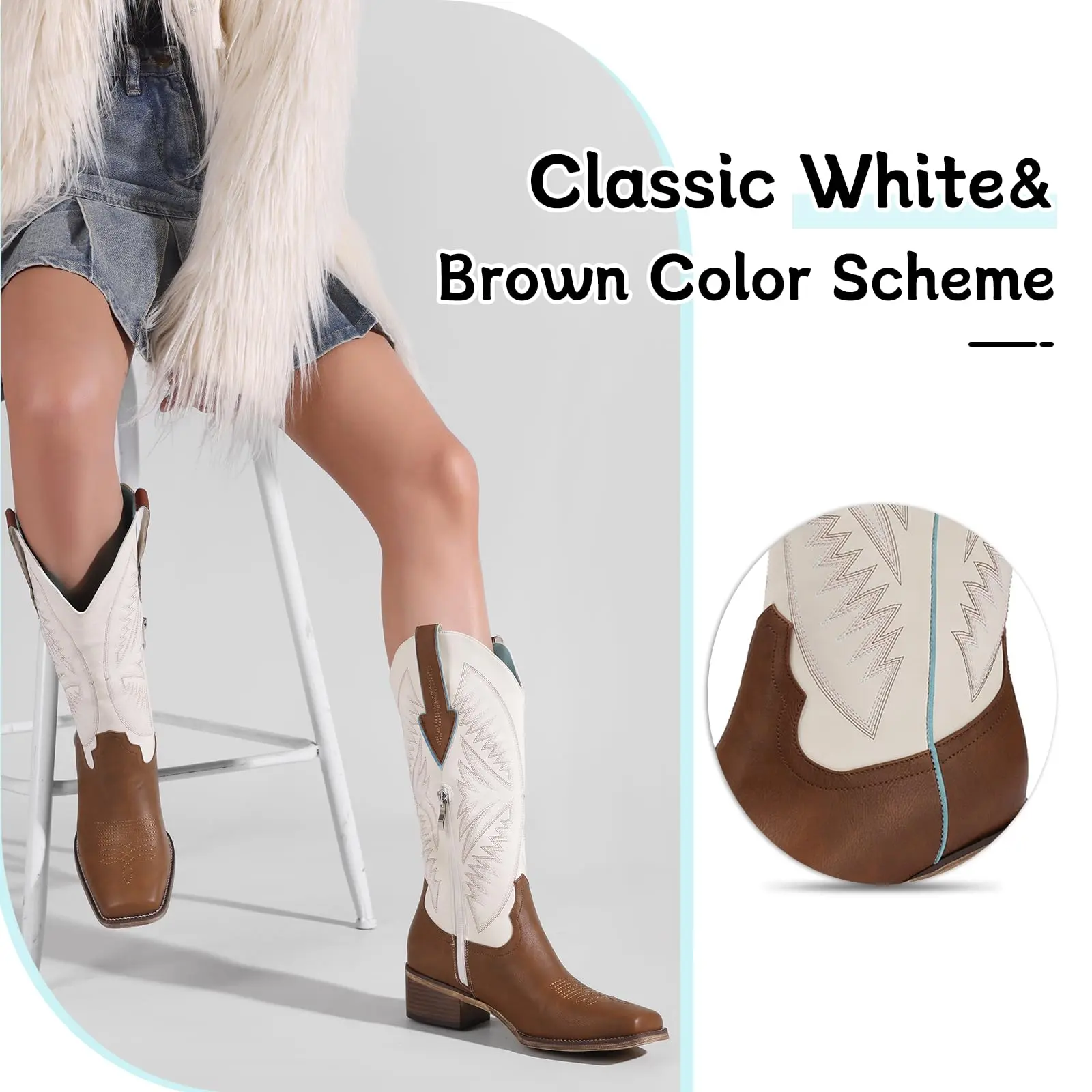 Turn heads with the bold brown-and-white color block design. Detailed stitching on the shaft adds personality and flair—ideal for pairing with denim, dresses, or that perfect coastal cowgirl look.