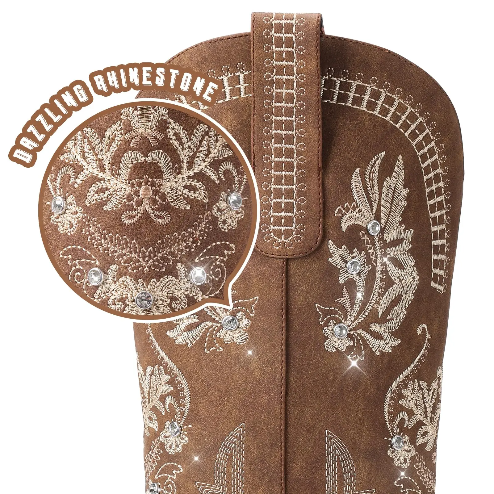 【Retro and Fashion】women's cowgirl boots epitomize the flawless fusion of vintage western and modern fashion, ensuring you stride with confidence and charisma wherever your journey takes you. Wide calf cowboy boots for women boast timeless embroidery designs, sparkling rhinestones, and a classic pointed toe, elevating your style with a captivating blend of vintage charm and modern allure.