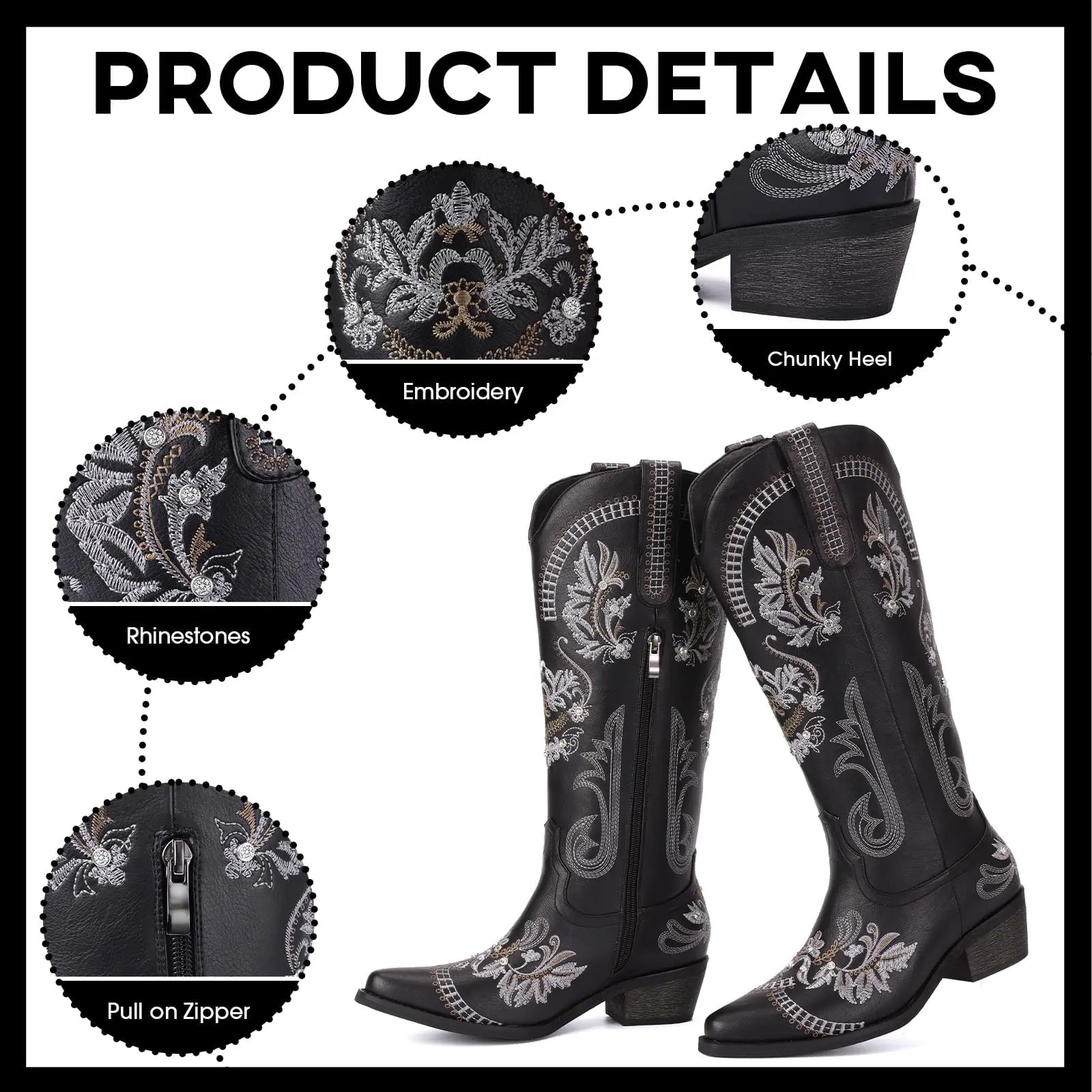 【Versatile and Handy】Western cowboy boots women suitable for a variety of outfits, skirt or jeans. Perfect for event attendance, from country-themed events to daily wear, country concerts, cowboy-themed parties, women's conferences, and rustic-themed weddings, they add a touch of charm to any gathering. Plus, with their convenient zipper feature, they're easy to put on and take off. Cowgirl boots pair perfectly with western cowboy carter outfits, creating a stylish and harmonious look