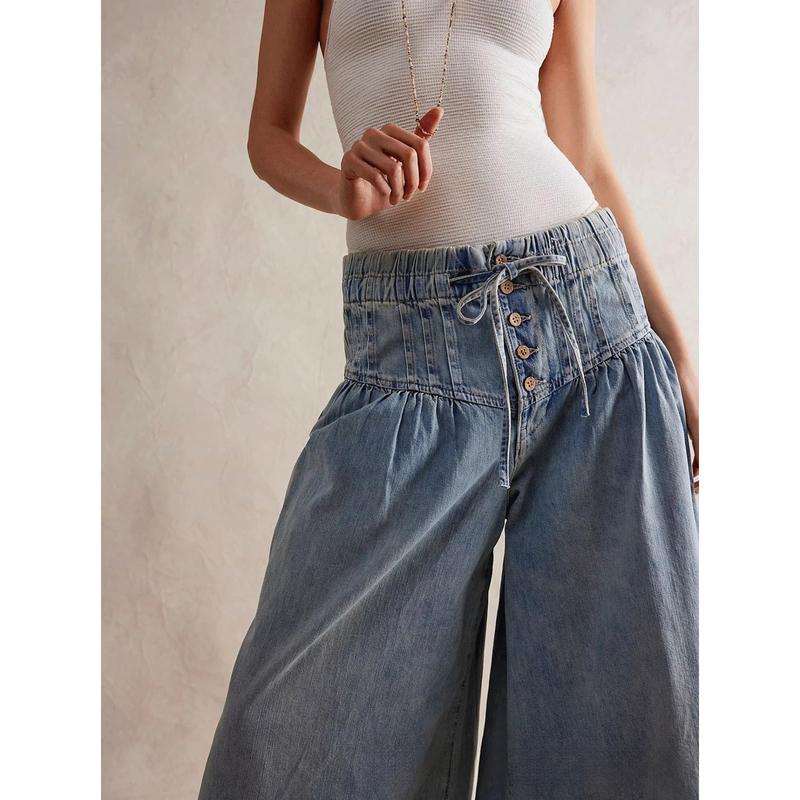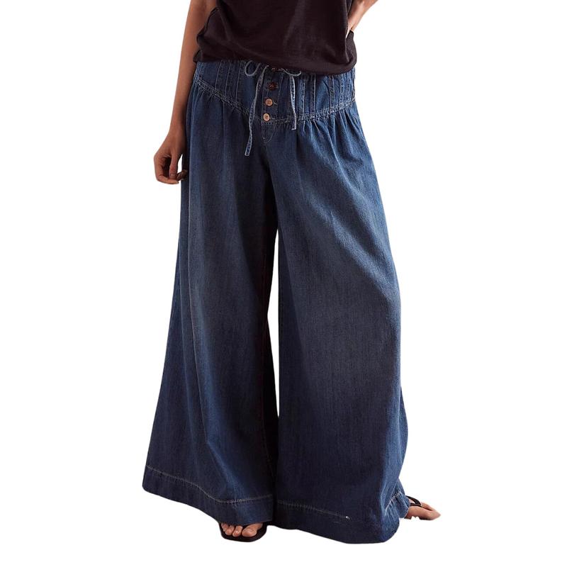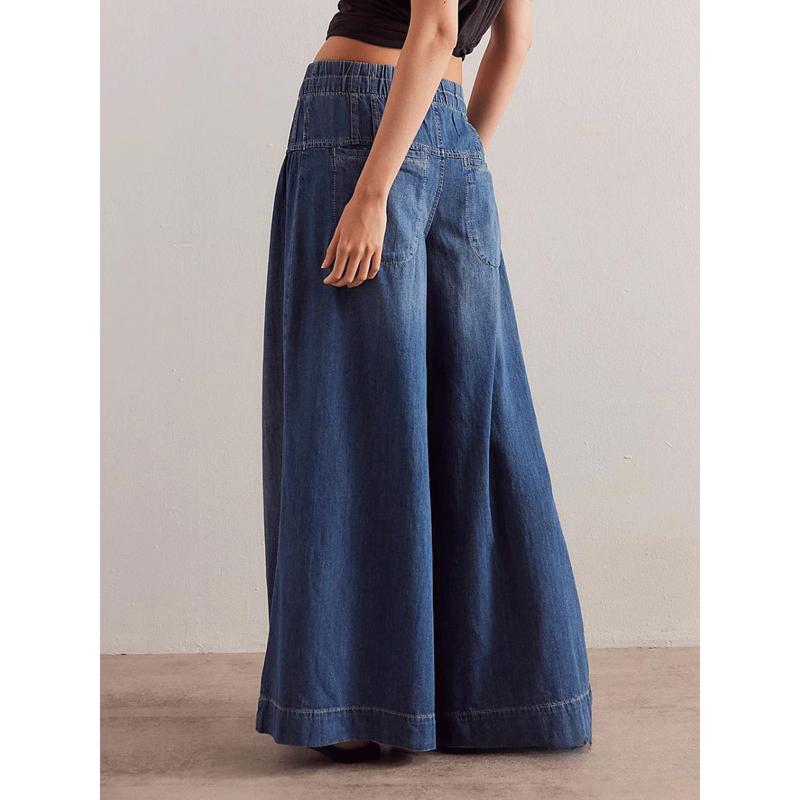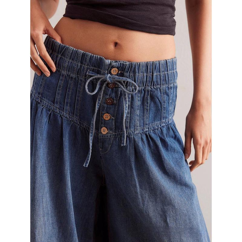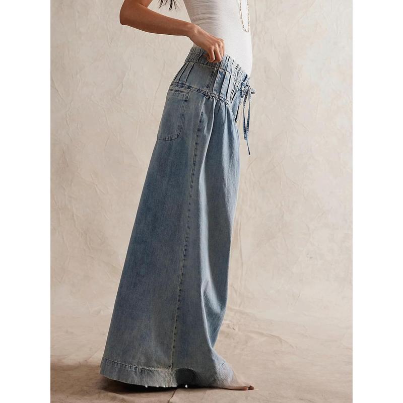 ·【Dressy Elastic Midi Rise Jeans】 Baggy jeans for women dressy casual mid waisted denim pants/ Ruffle pleated wide leg long pants with pockets/ Flare leg denim pants for women/ Plus size pants for women/ Casual loose drawstring trousers/ Dark blue jeans