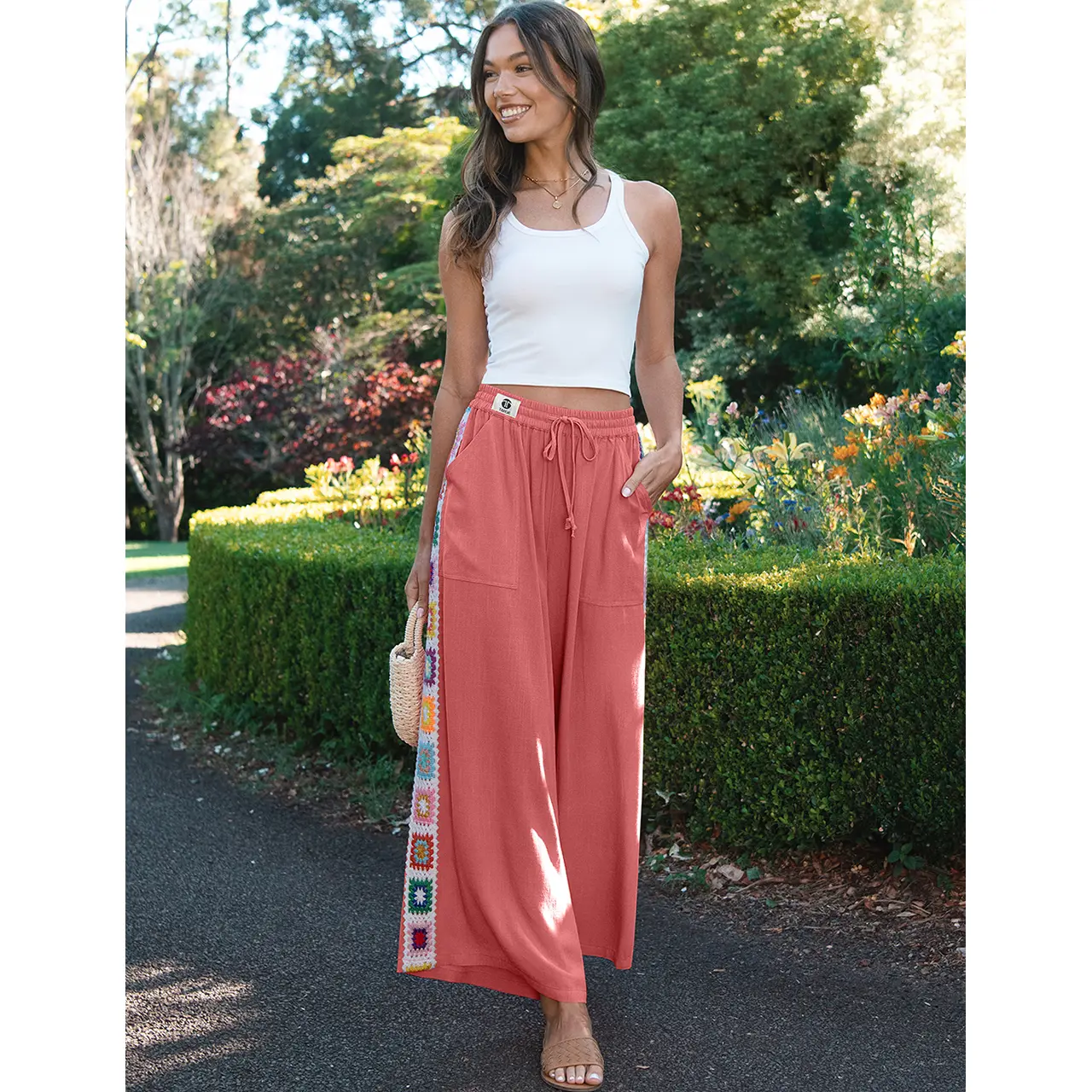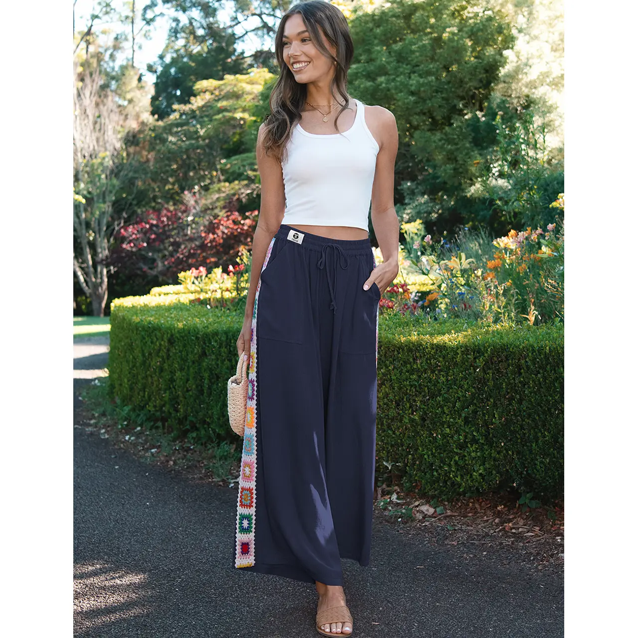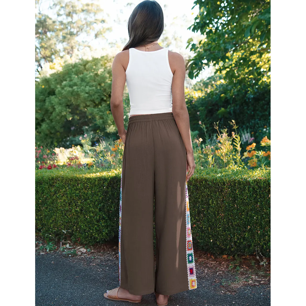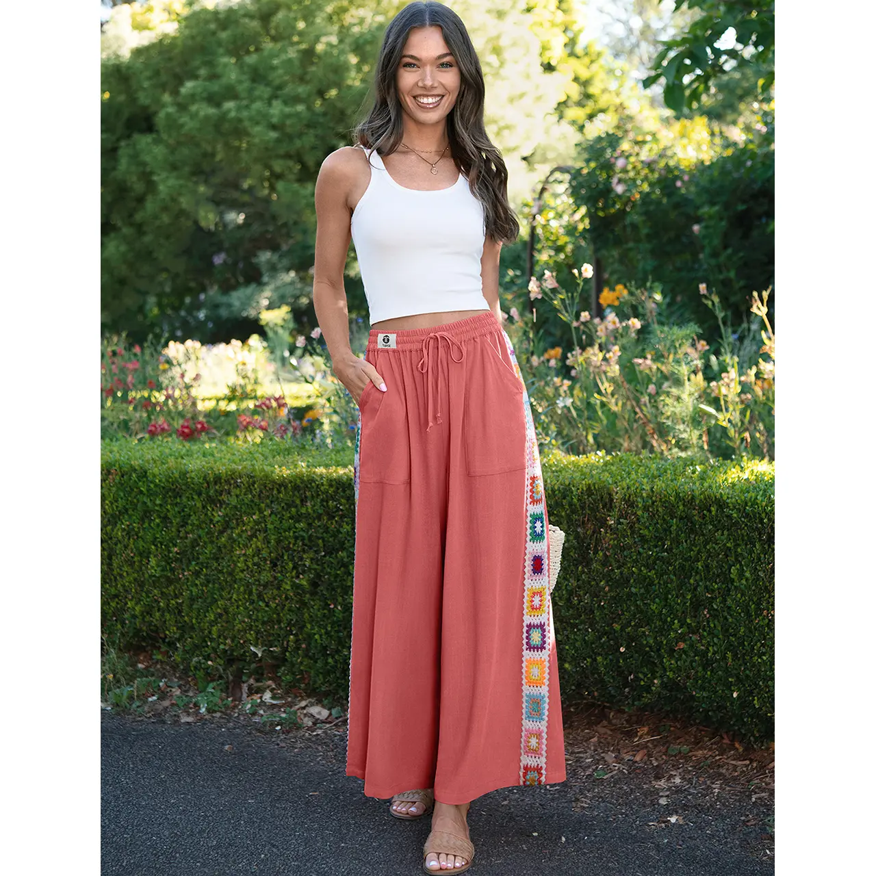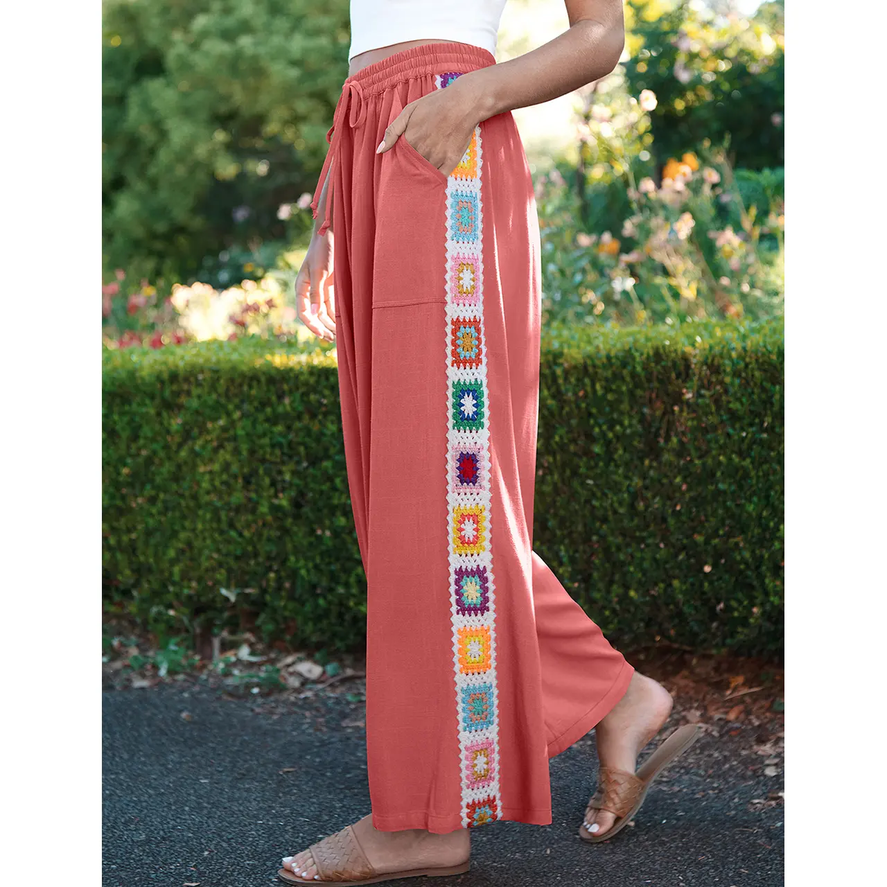 Boho-inspired palazzo pants featuring unique crochet side panels, wide legs, front patch pockets, and an adjustable drawstring waist for a relaxed, chic silhouette.