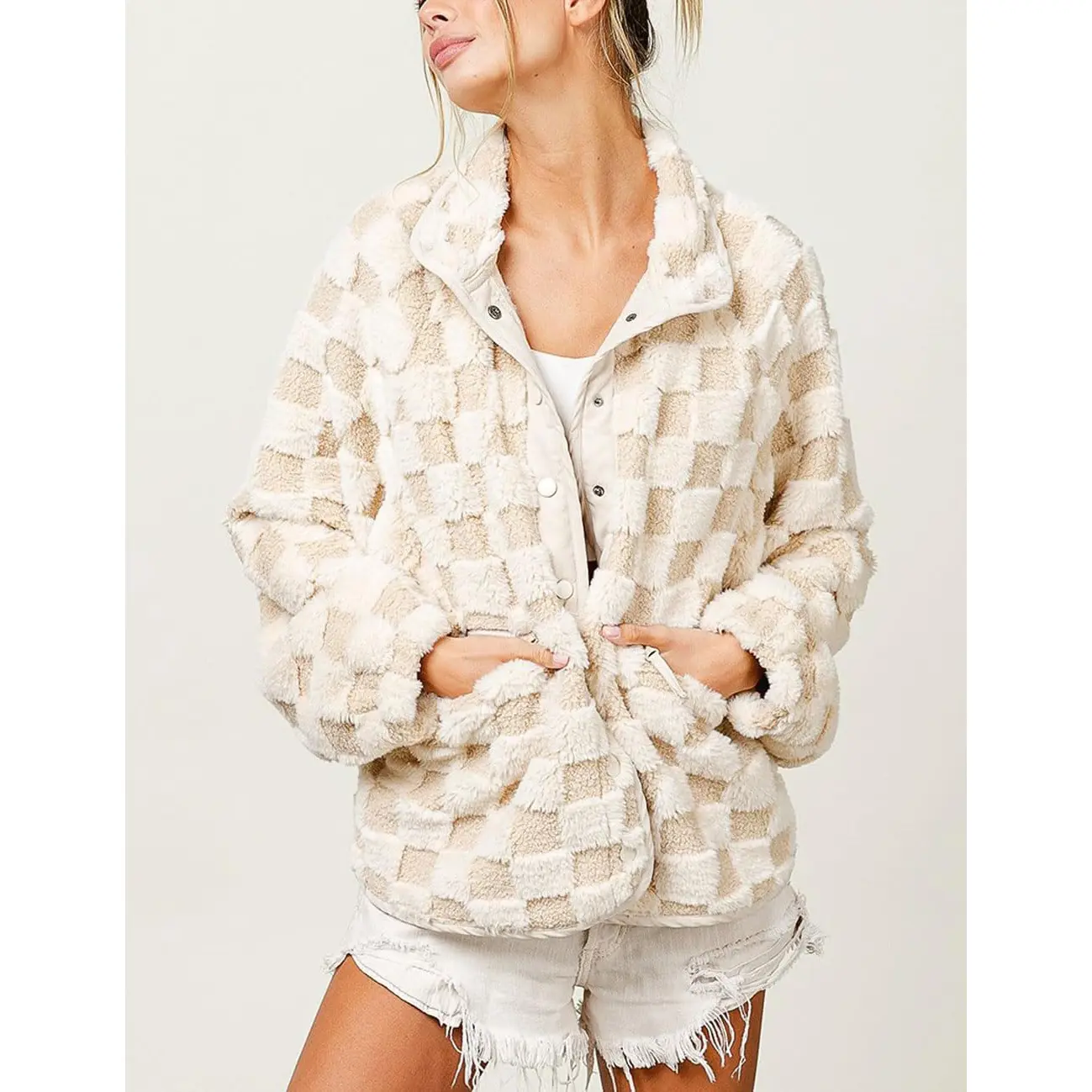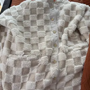 ·Fall plaid fleece jacket loose fit, featuring contrast color checkered pattern overlay, chic and eye-catching; Stand collar, front button down closure, long sleeve with drop shoulder, relaxed fit