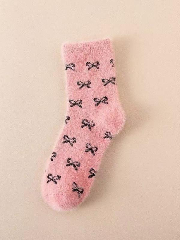 5. Women's Winter Socks Set, 5 Pairs Faux Fur Butterfly Knot Design, Cute Sweet Mid-Calf Sleepwear Warm Thickened Socks for Women, Soft Comfy Socks