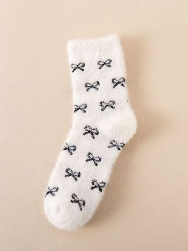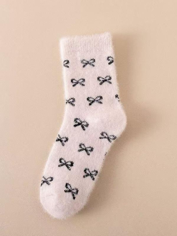 Women's Winter Socks Set, 5 Pairs Faux Fur Butterfly Knot Design, Cute Sweet Mid-Calf Sleepwear Warm Thickened Socks for Women, Soft Comfy Socks