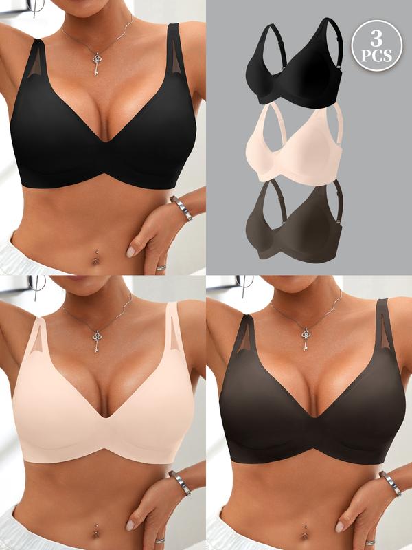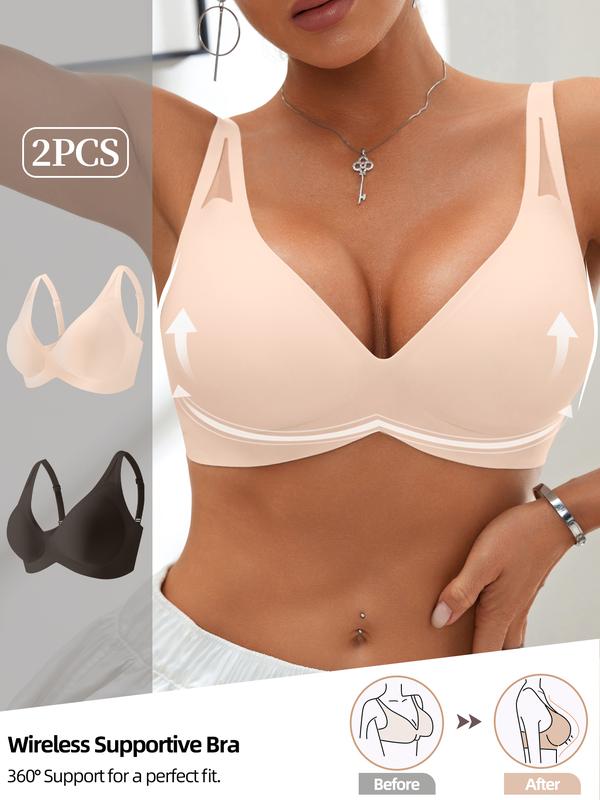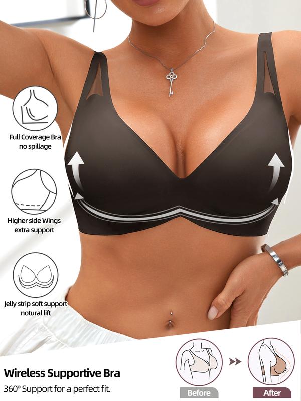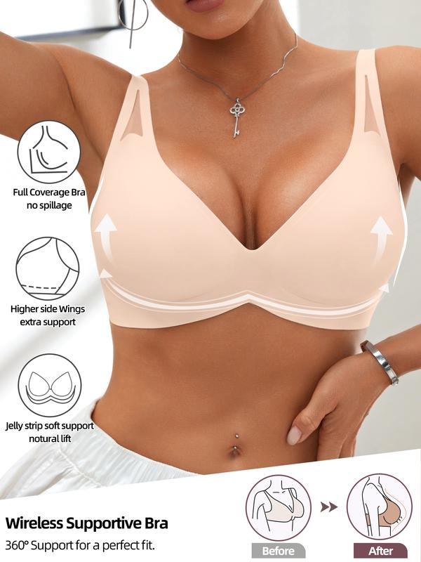 Women's Wireless Jelly Bra, Wide Shoulder Lace Design, Seamless V-Neck, Medium Support, Fitted Lined Bra, All Seasons
