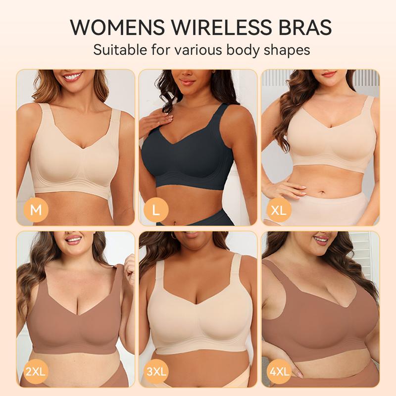 Our no wire seamless bra features upgraded 4-layer 360° jelly strips that replace traditional underwires. It delivers firm support and effective bounce control. Designed without underwires, these bras eliminate irritation and ensure a buttery-soft feel all day long. Perfect for all seasons, they offer full coverage and back smoothing.