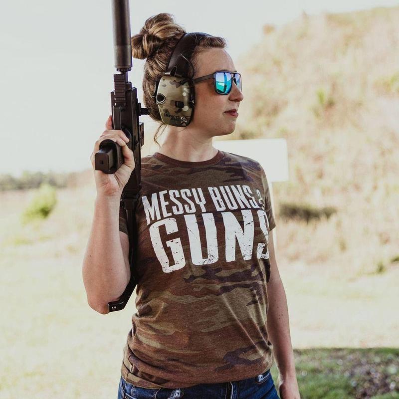 Woodland Camo Messy Buns & Guns for WomenQuantities are limited, get them before they are gone. Additional discounts do not apply to marked down items.MATCH MADE IN 'MERICAWe've taken a classic design showing our love for Messy Buns and Guns and put it on the Woodland Camo colorway! Pair a messy bun with some strong guns and feel the pride of being an American!So rock your messy bun and let the guns run proudly, because expressing your Second Amendment right is a patriotic duty. Show off your right to bear arms by ordering your Women's Woodland Camo Messy Buns & Guns Tee today!Our Women's Woodland Camo Graphic Tees are crafted with the following details: