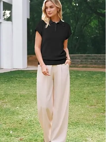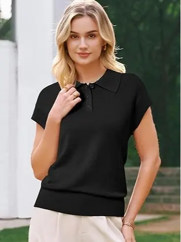 ·Design: Polo V-neck, cap sleeves, and ribbed hem for an elegant, effortless silhouette, with a soft yet structured collar that holds its shape for a polished all-day look