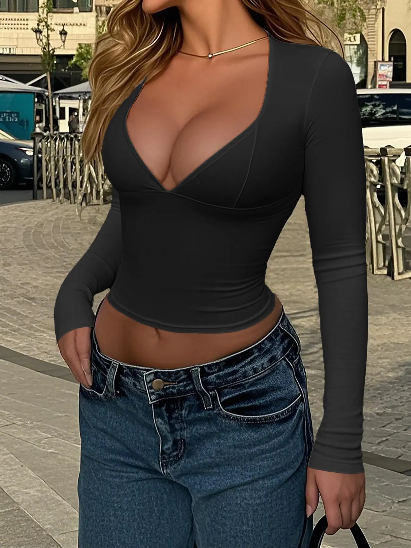 Women's Y2K Sexy Deep V Long Sleeve Knit Crop Top, Comfortable Fabric, Slim Fit, Perfect for All Seasons, Casual Fashion Tee