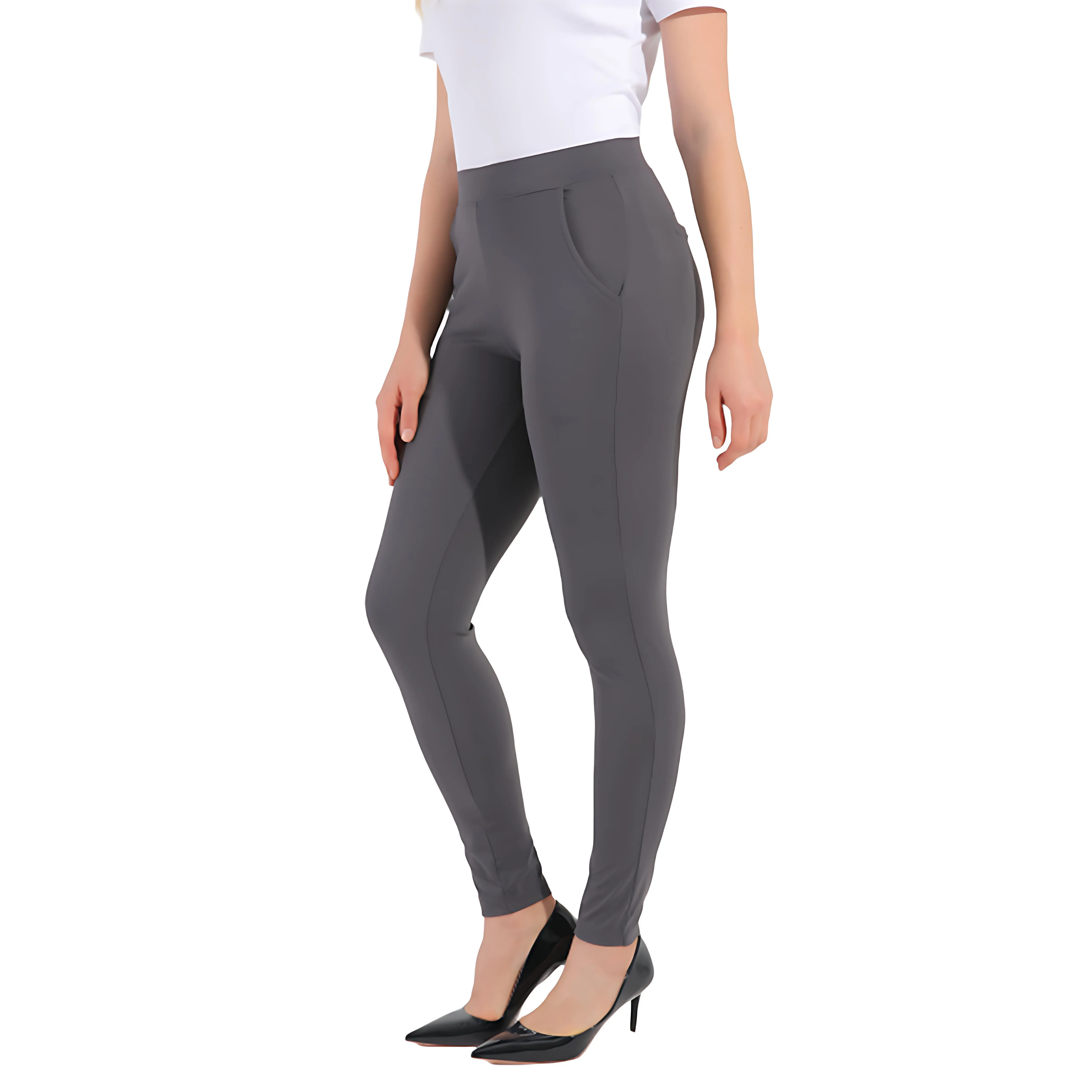 Features a high-waisted tummy control silhouette with an elastic waistband (plus belt loops) and faux fly detail for a sleek, dressy appearance. The pull-on design ensures effortless wear without sacrificing style.
