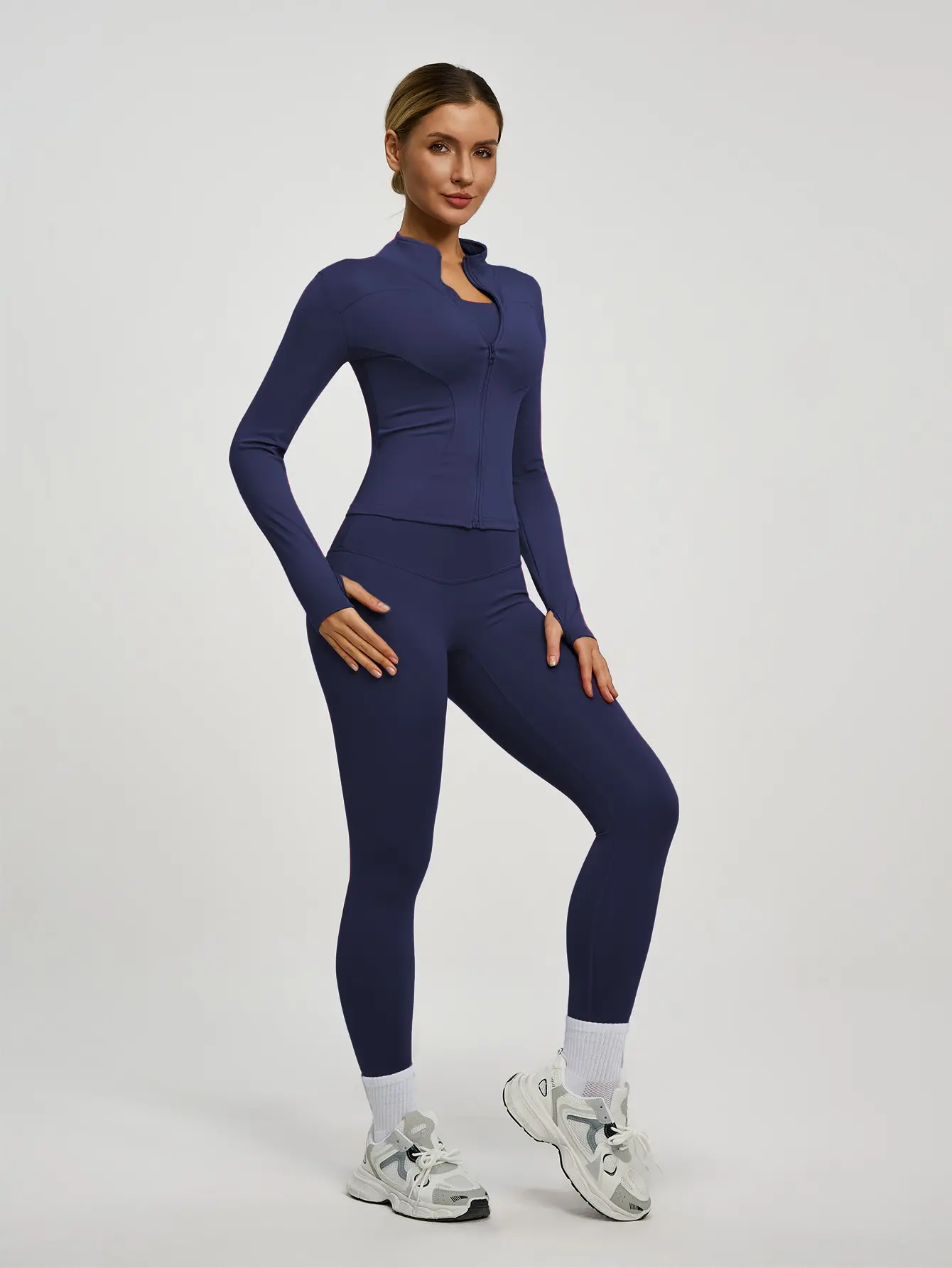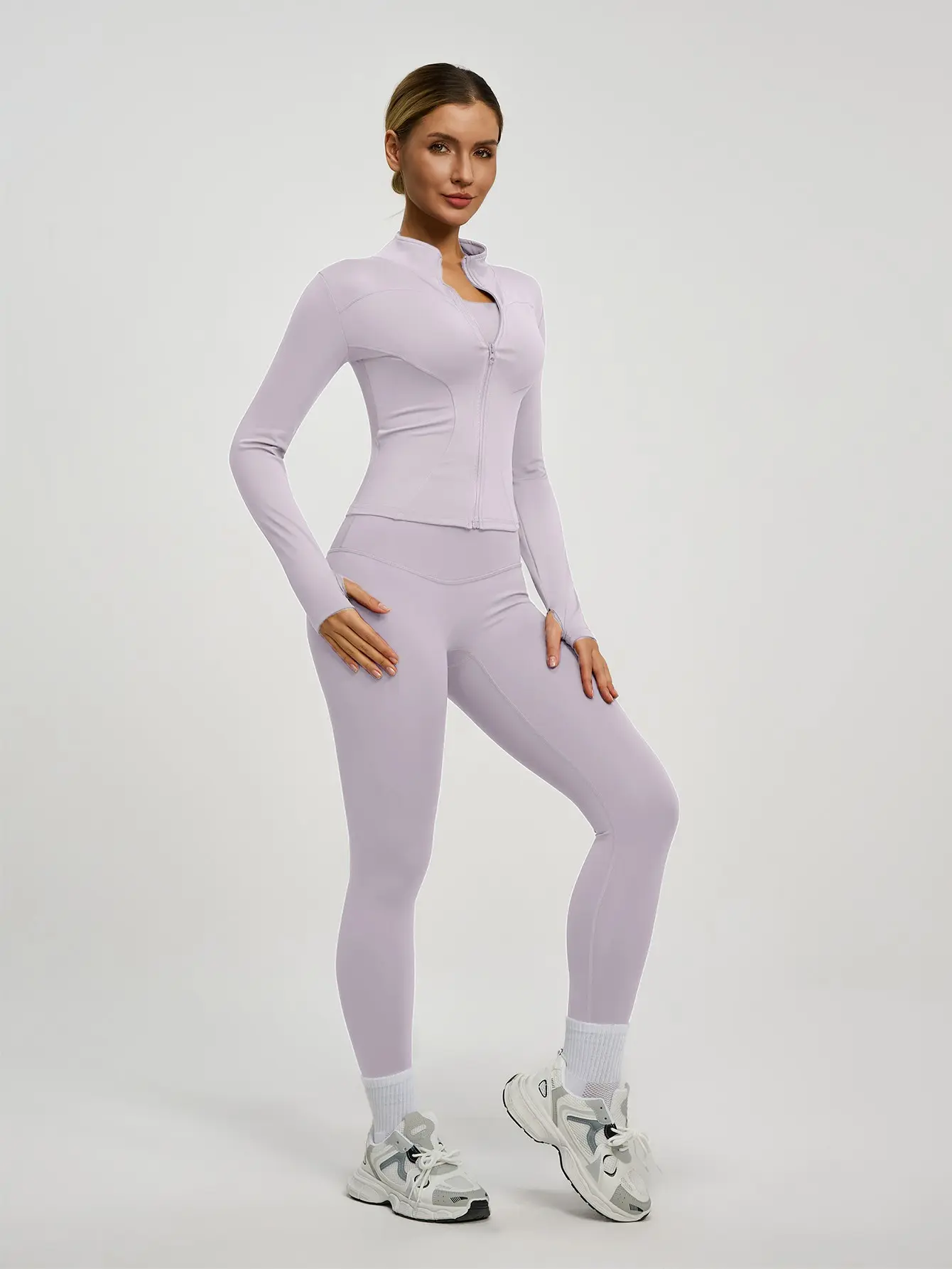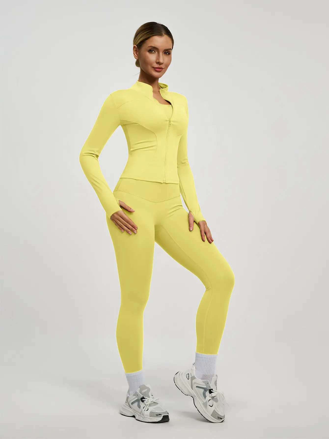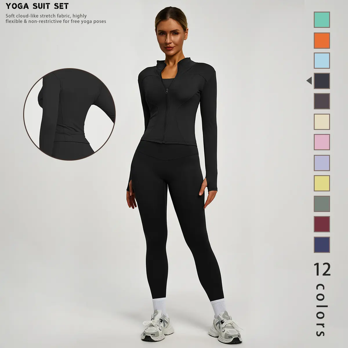 This set includes a long-sleeved jacket with a zipper and slim-fit pants. Perfect for yoga, gym training, running, and daily wear. Available in multiple colors. The jacket features thumbholes and a small stand-up collar. It's high-elastic and comfortable, suitable for all seasons. ๐
