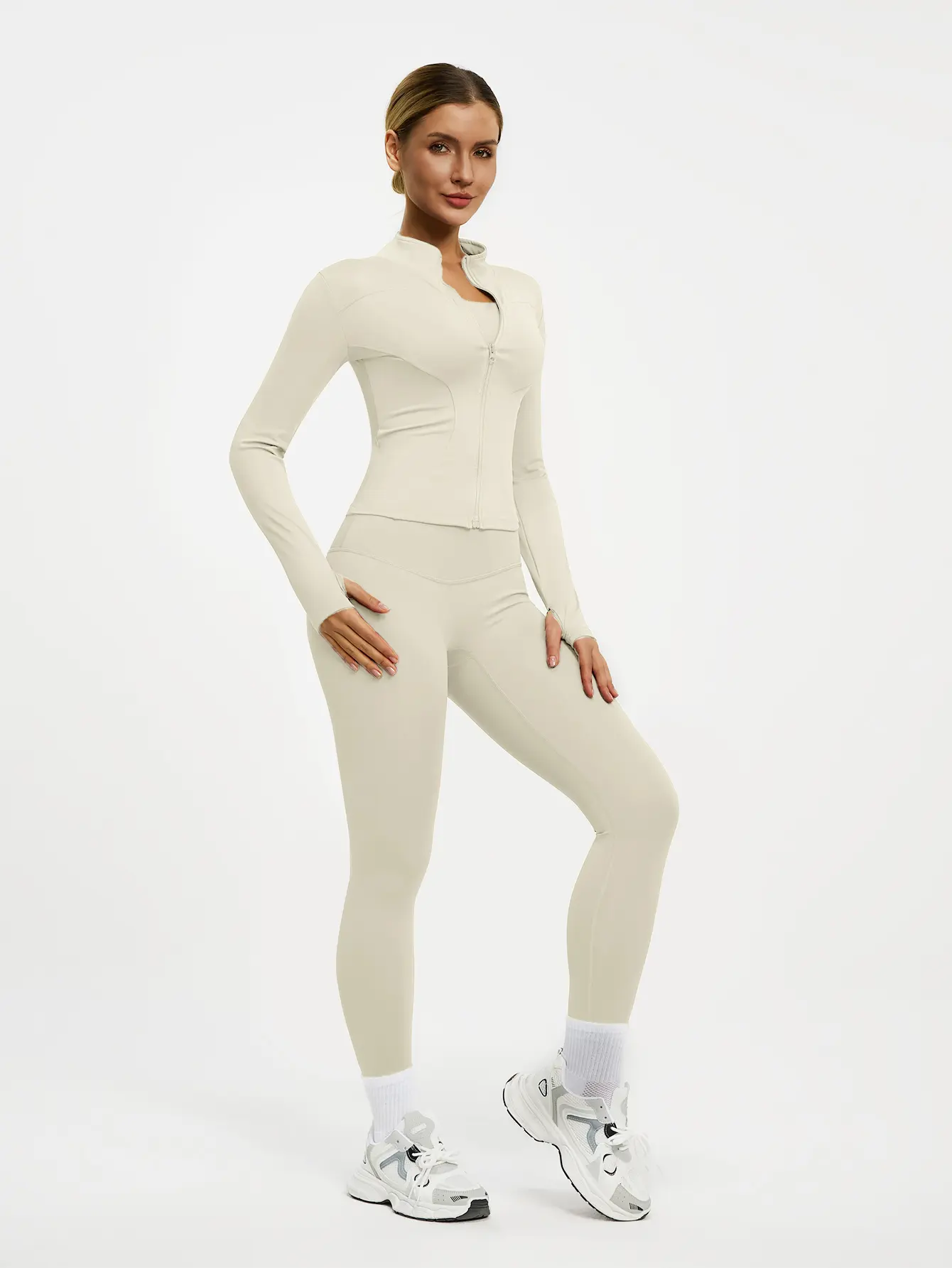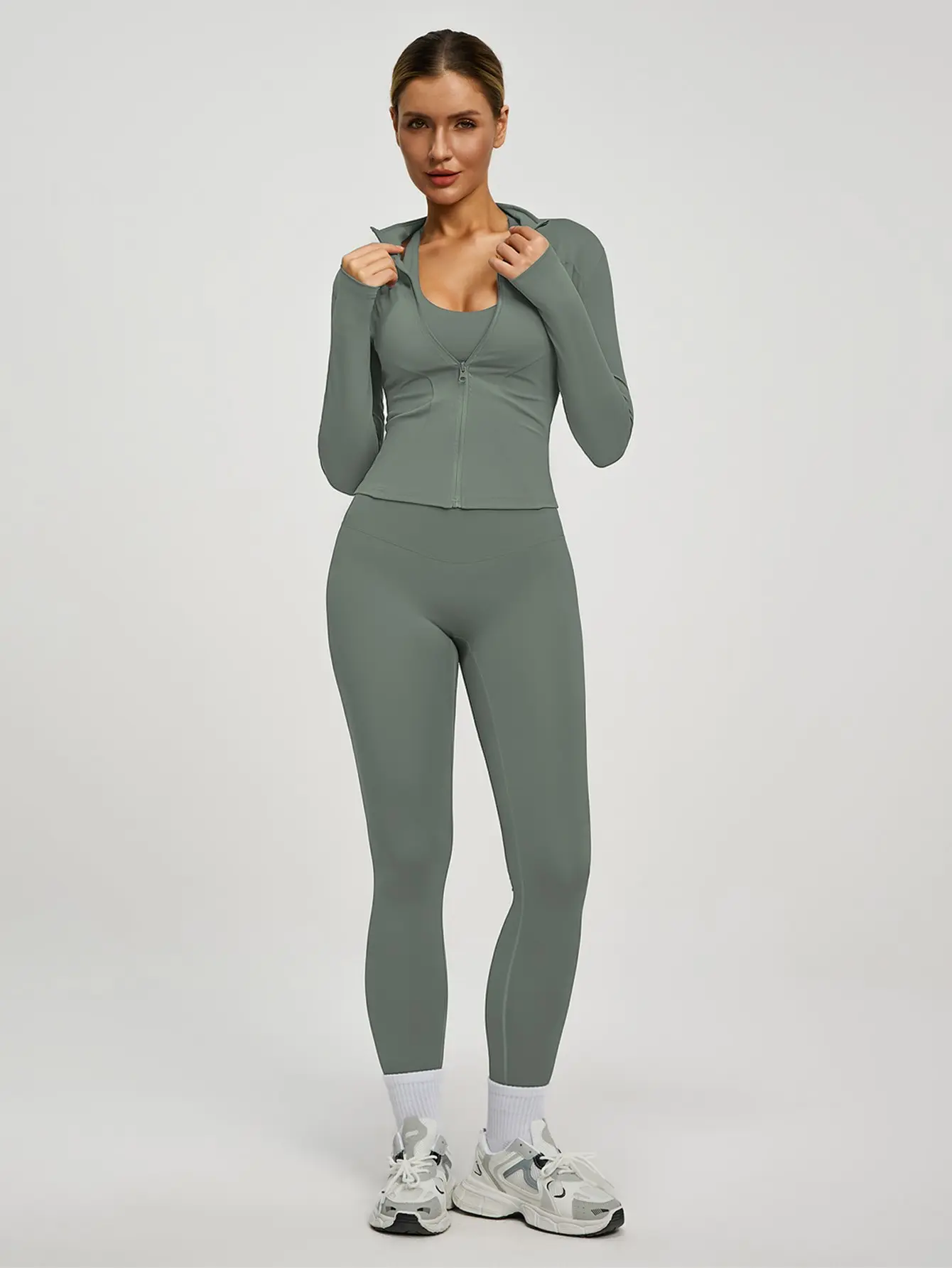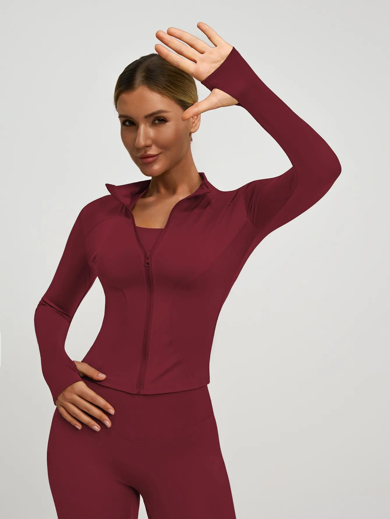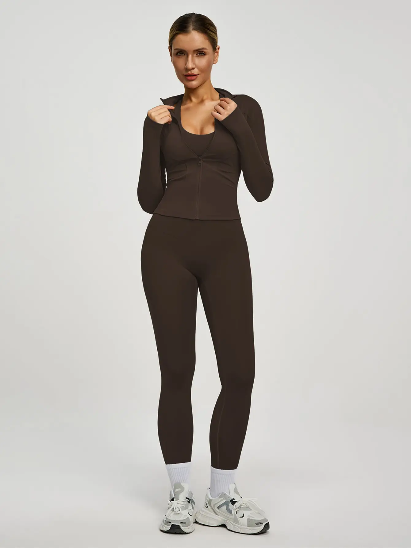 This set includes a long-sleeved jacket with a zipper and slim-fit pants. Perfect for yoga, gym training, running, and daily wear. Available in multiple colors. The jacket features thumbholes and a small stand-up collar. It's high-elastic and comfortable, suitable for all seasons. ๐