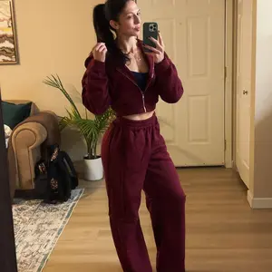 The sweatsuit is very thick and I love the rich color, however this is not short girl friendly. I’m 5’1 and 155 lbs and ordered a small. I wore it with my platform UGG tasmans to help with the length of the pants. The hoodie is smaller around the waist area where you have to start zipping.