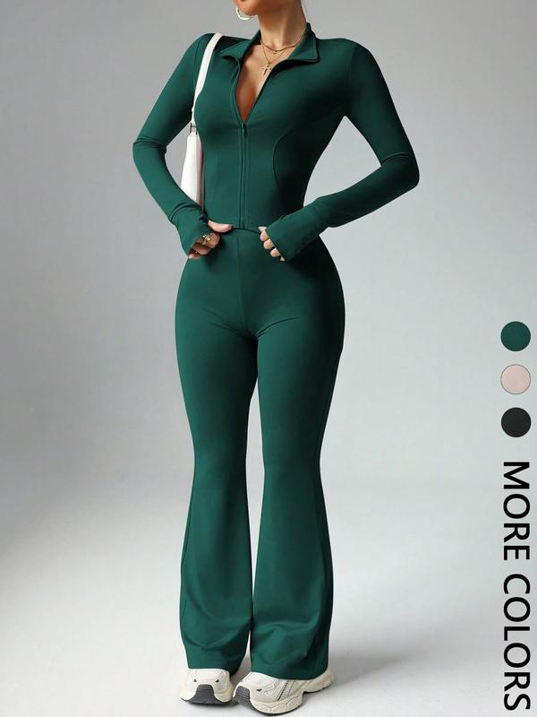 Women's Solid Color Long Sleeve Zipper Jacket & Flare Pants Set, Casual for Daily Wear, Ladies Fashion Clothing Combo