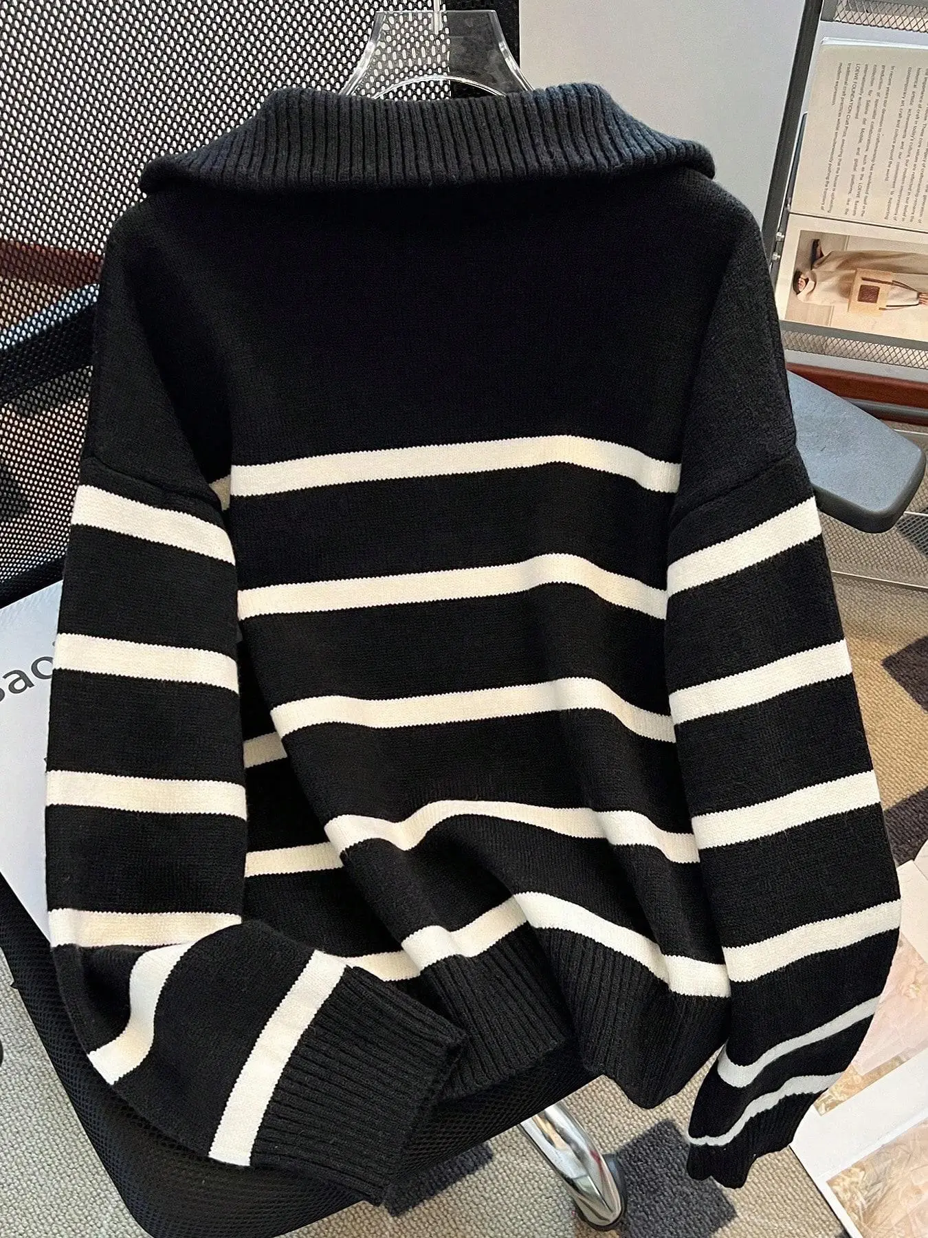 5. Women's Striped Print Zipper Drop Shoulder Sweater, Casual Long Sleeve Collared Jumper for Daily Outdoor Wear, Women Knitwear Top for Fall & Winter, National Day Clothing