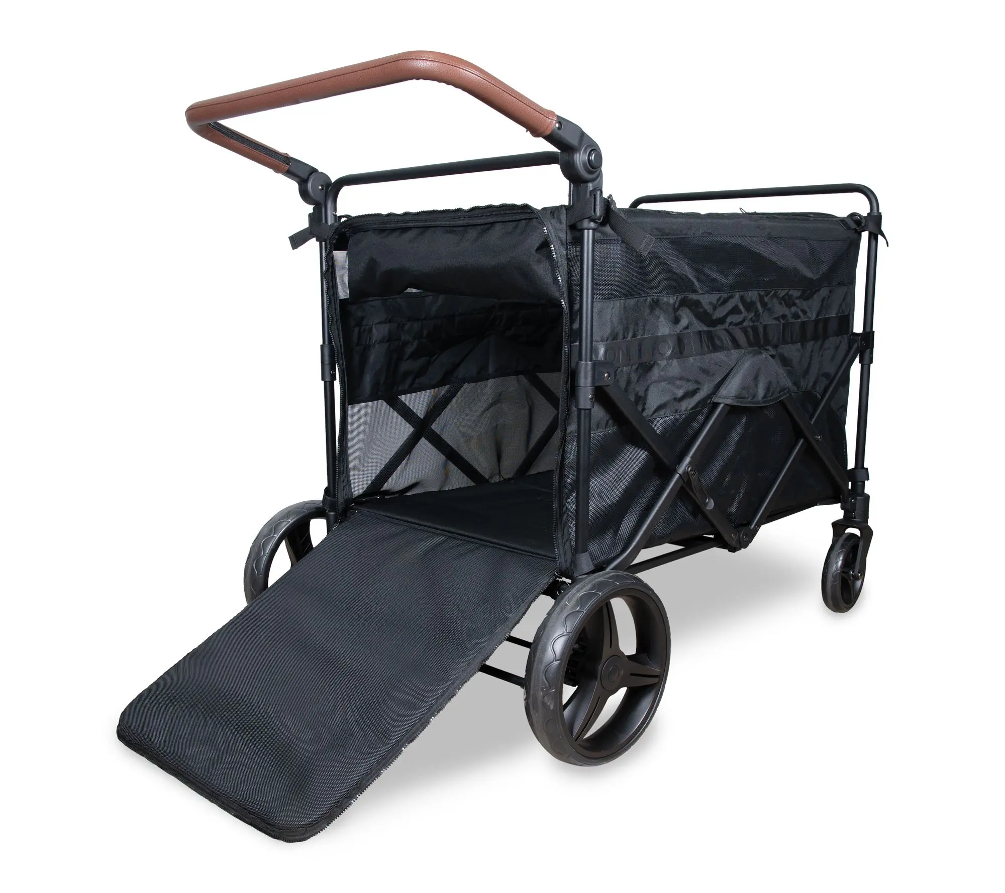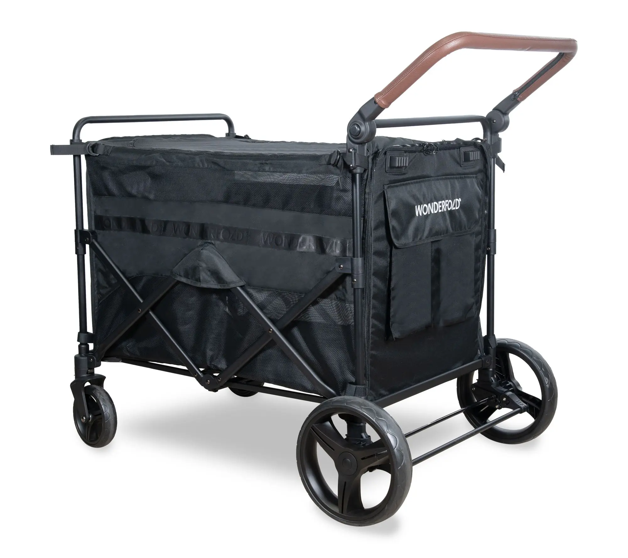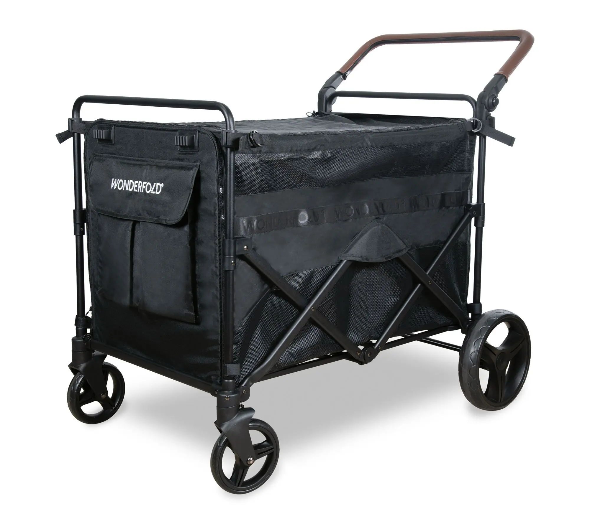 Take your daily walks to the next level with this spacious pet stroller -- designed to accommodate larger dogs or multiple smaller companions while keeping them safe and comfy. Easy zippered entrances, a mesh top for breezy rides, and handy pockets for treats or essentials ensure every outing feels special. From Wonderfold.