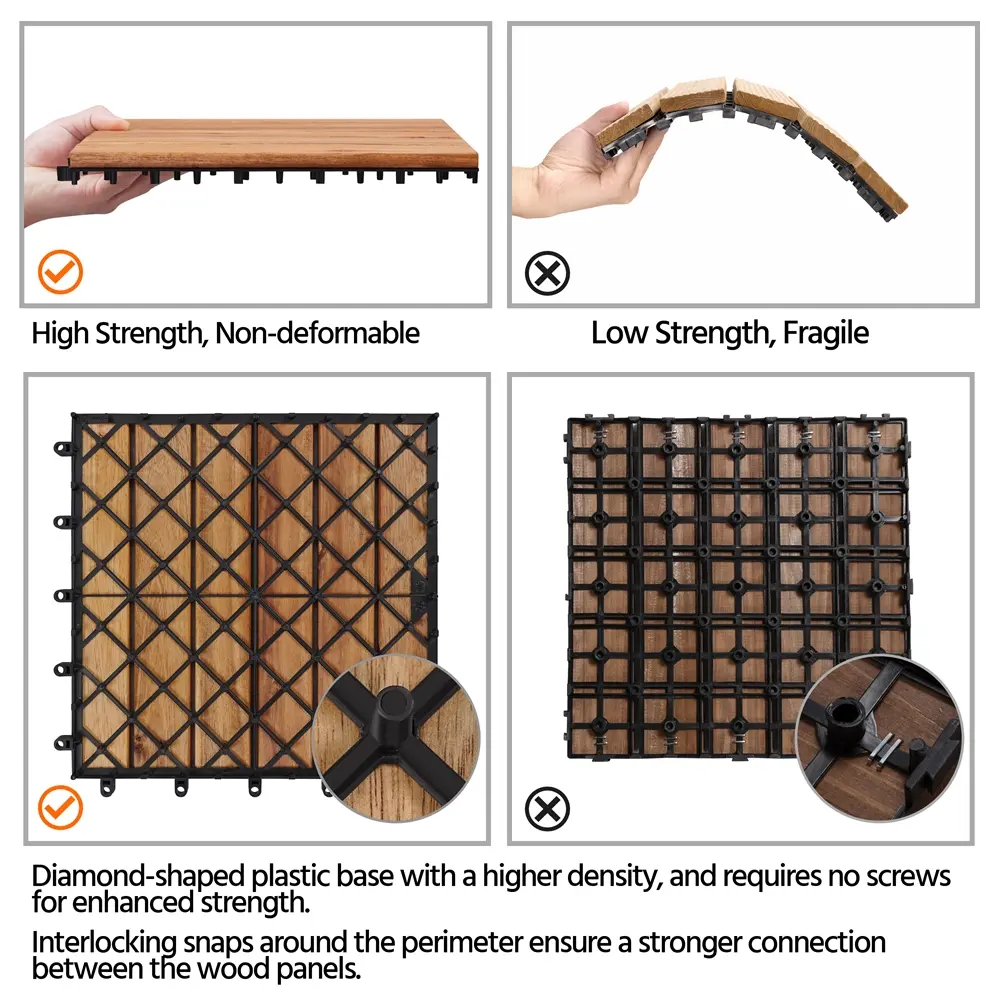 1.Durable & Natural Material: Our wooden tiles are made from natural acacia wood and a high-grade PVC plastic base. They are engineered to withstand cracking, even in damp conditions, ensuring excellent long-term durability