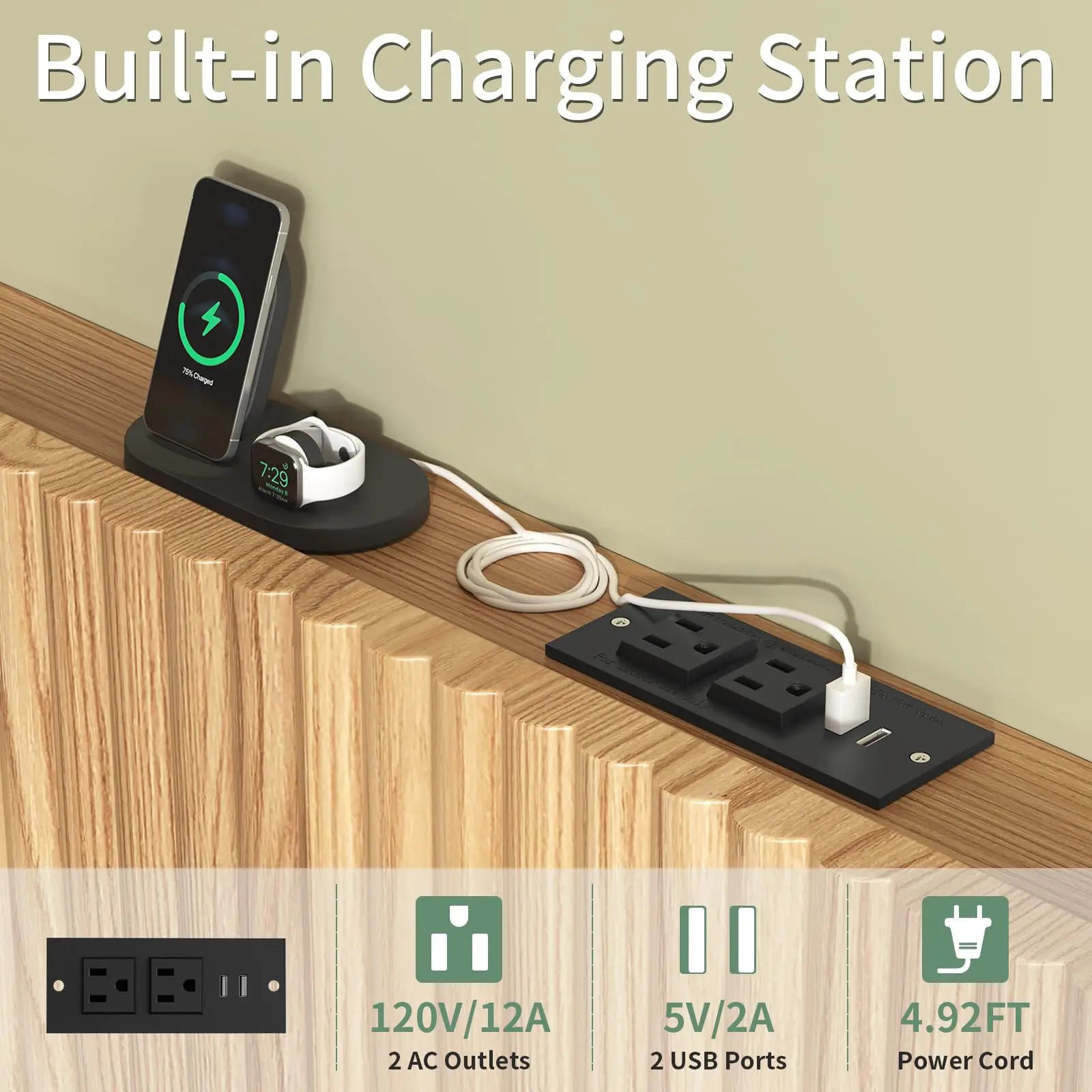 ·Convenient Built-In Power Station: Equipped with 2 standard AC outlets (125V/12A) and 2 USB ports (5V/2A), this headboard keeps your devices charged and within reach. The 4.92-ft power cord offers flexible placement, making it ideal for charging for watch,phone or lamp.