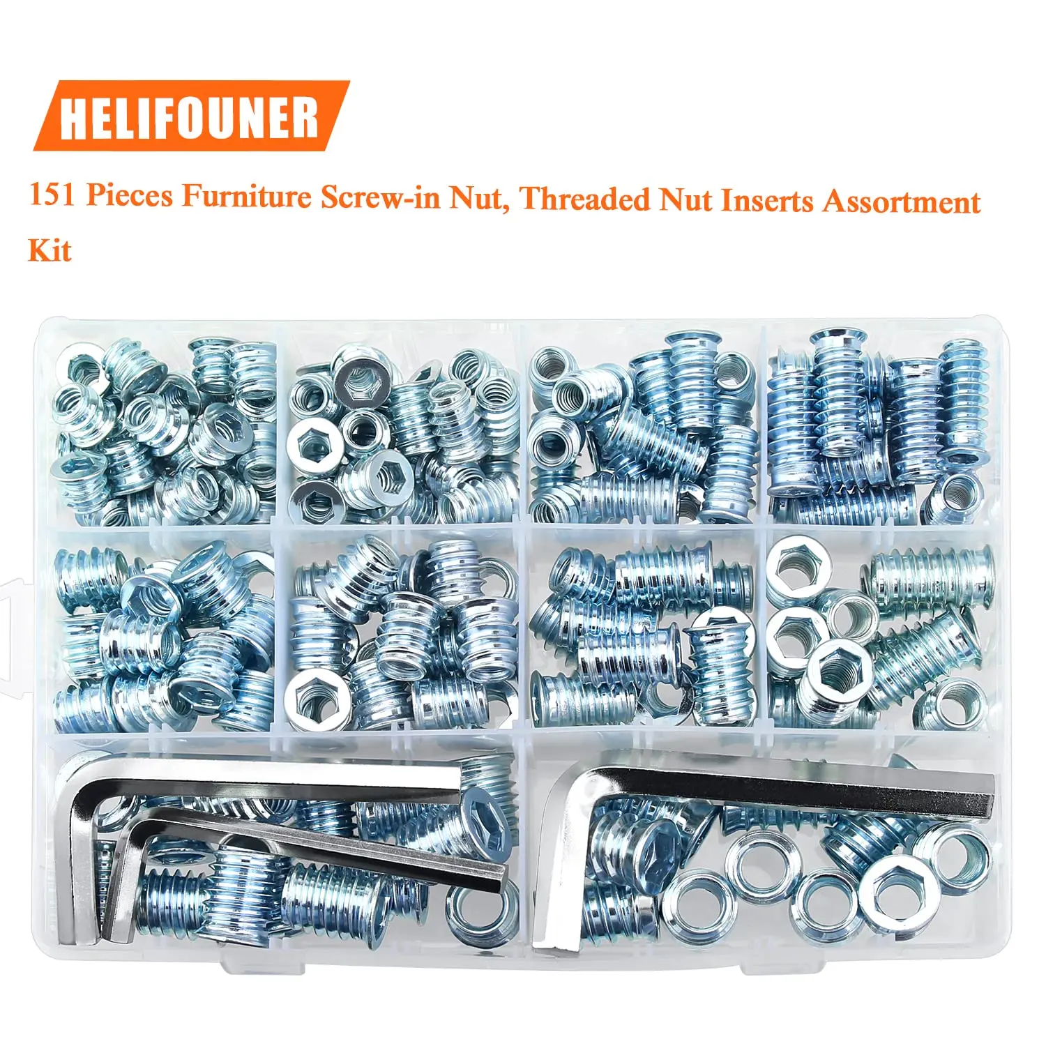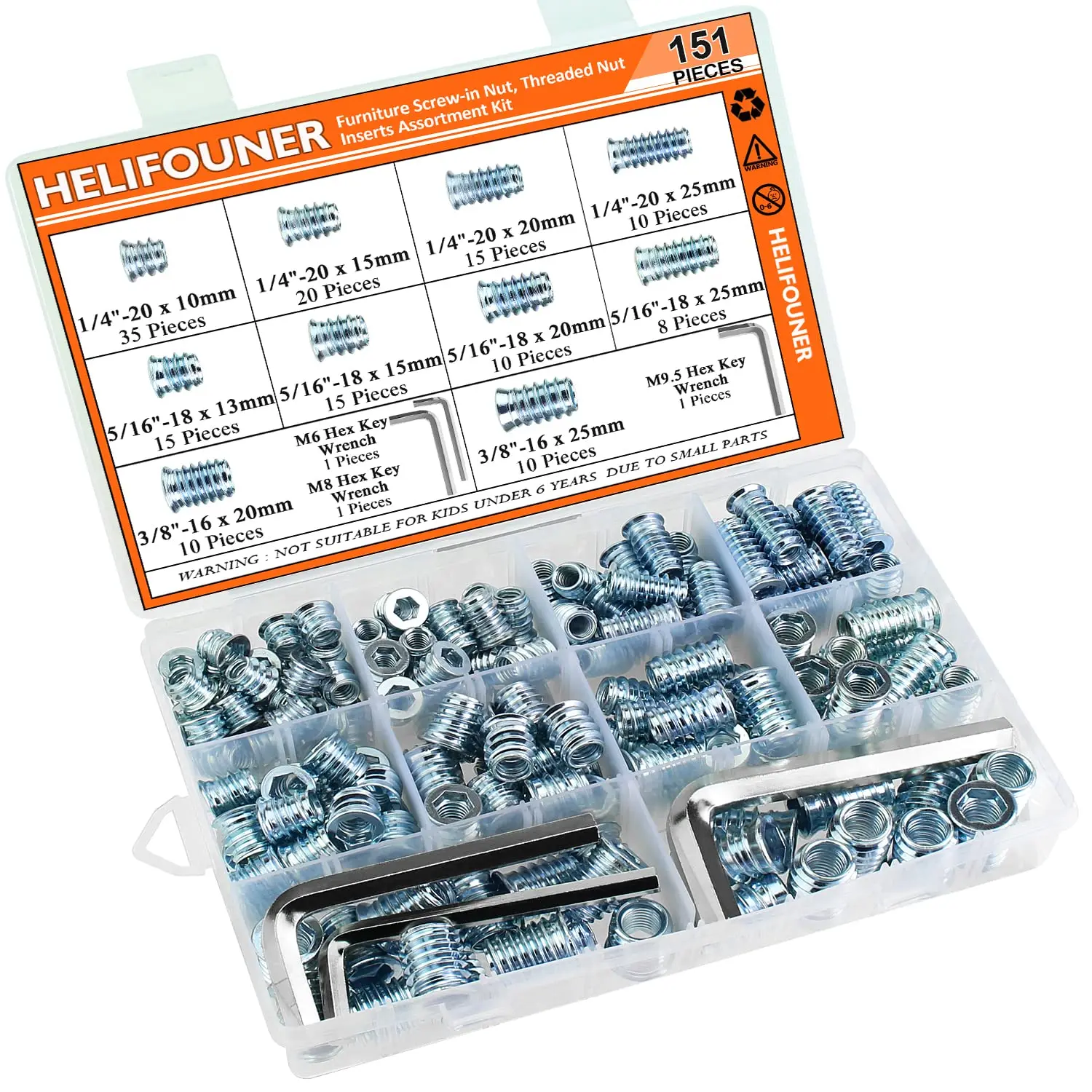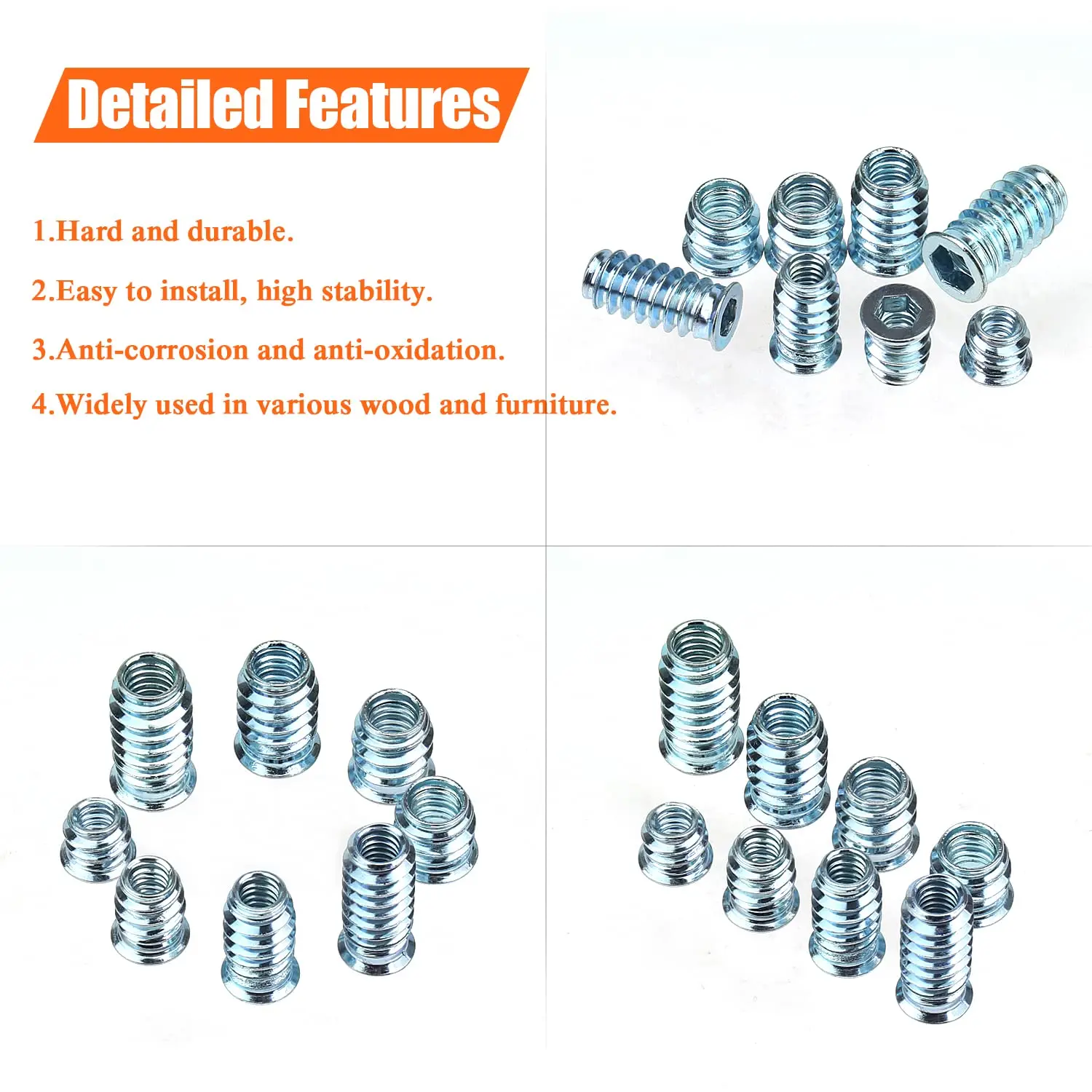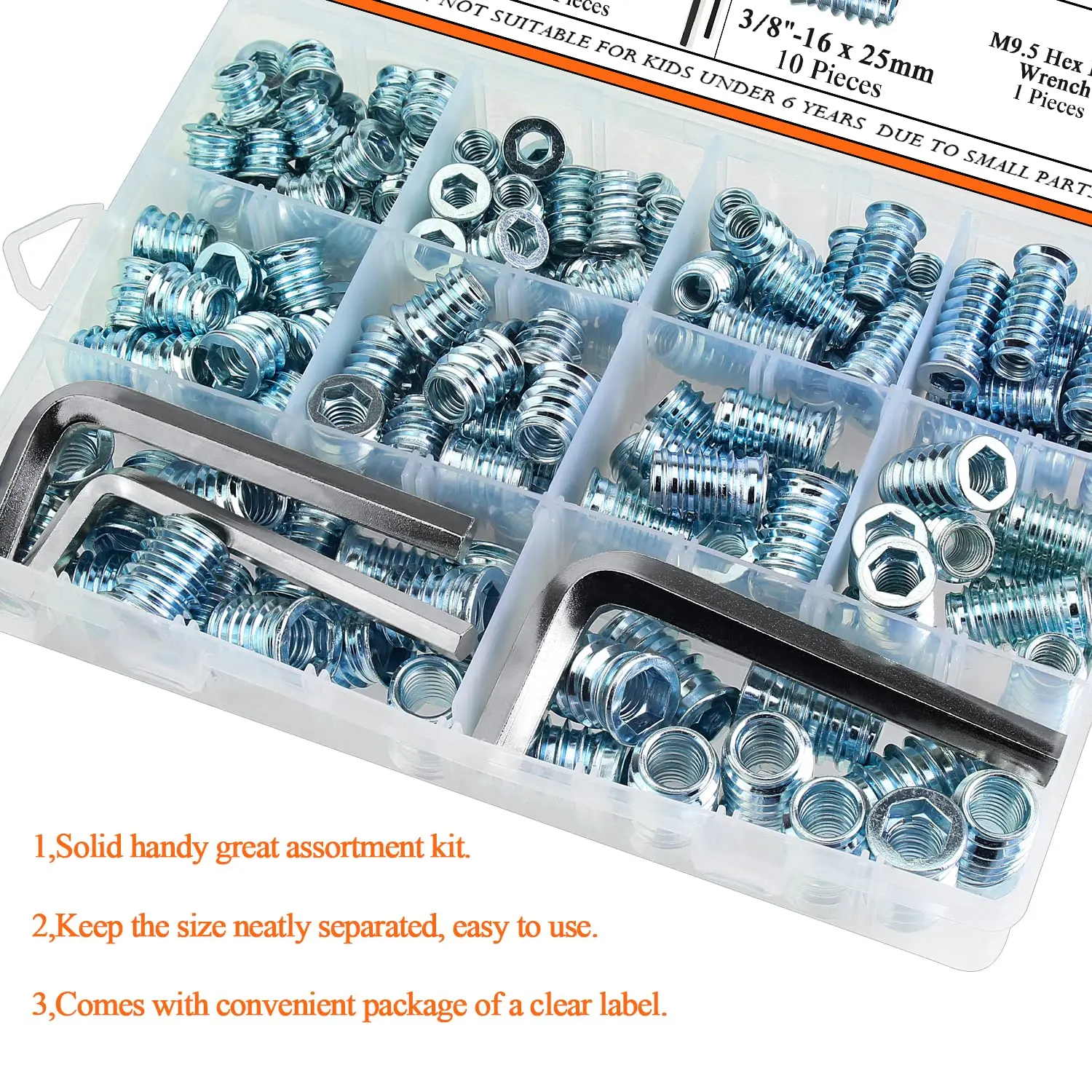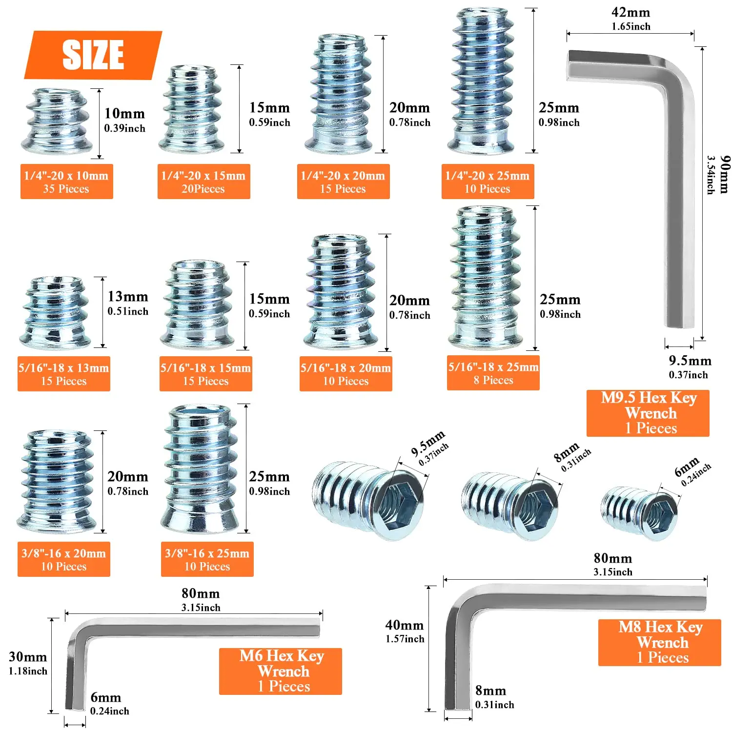 [Detailed Dimensions]1/4"-20 x 10mm/15mm/20mm/25mm, 5/16"-18 x 13mm/15mm/20mm/25mm, 3/8"-16 x 20mm/25mm, 10 sizes commonly used threaded inserts in a plastic case, different sizes can satisfy your different needs, coarse thread, fit standard 1/4 20 screws bolts, 5/16 18 screws bolts and 3/8 16 perfectly.[Blue Zinc Plated Steel]Made of high quality carbon steel, blue zinc plated on the surface which have good corrosion resistance in bad environment like high temperature, high hardness and perfect wear resistance, standard internal hex socket, without burr, smooth, non-slip, which can ensure long time using.[Easy To Install]You can drill a hole by using a 9.5mm /12mm /15mm drill bit, ensure a precise 90 degree angle for inserting the threaded inserts, then you need to screw the inserts into the 9.5mm /12mm /15mm holes by using our hex wrench.Make sure you countersink the hole to head size before you insert the threaded sleeve, fit standard 1/4 20, 5/16 18, 3/8 16 screws bolts perfectly.[Threaded Inserts Assortment Kit]Total 148 pieces 10 sizes threaded inserts are packed in a durable transparent box with label for you.It is easy to distinguish the size of the product, you can choose the suitable one to use in your wood furniture.Our threaded inserts have standard internal hex socket, without burr, smooth, non-slip.[Wide Applications]You can use our threaded inserts to repair file cabinets and chair leg, you can also use them on head board and foot board of wood furniture.Widely used for soft woods of pine, plywood, fiberboard, etc, work perfectly on the furniture combination, you just need to drill a hole that the size of the body into the wood for the threaded inserts.
