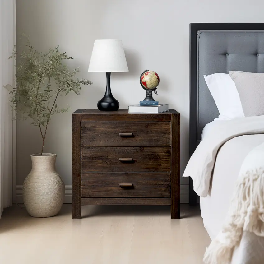 This nightstand come with 2 USB ports and 2 charger outlets in drawer back side. The charging options allow you to conveniently and simultaneously charge the electronic devices such as smartphones, tablets, laptops, or e-readers while you sleep or relax in bed. Crafted from solid pine wood, its frame features a subtle slatted design.