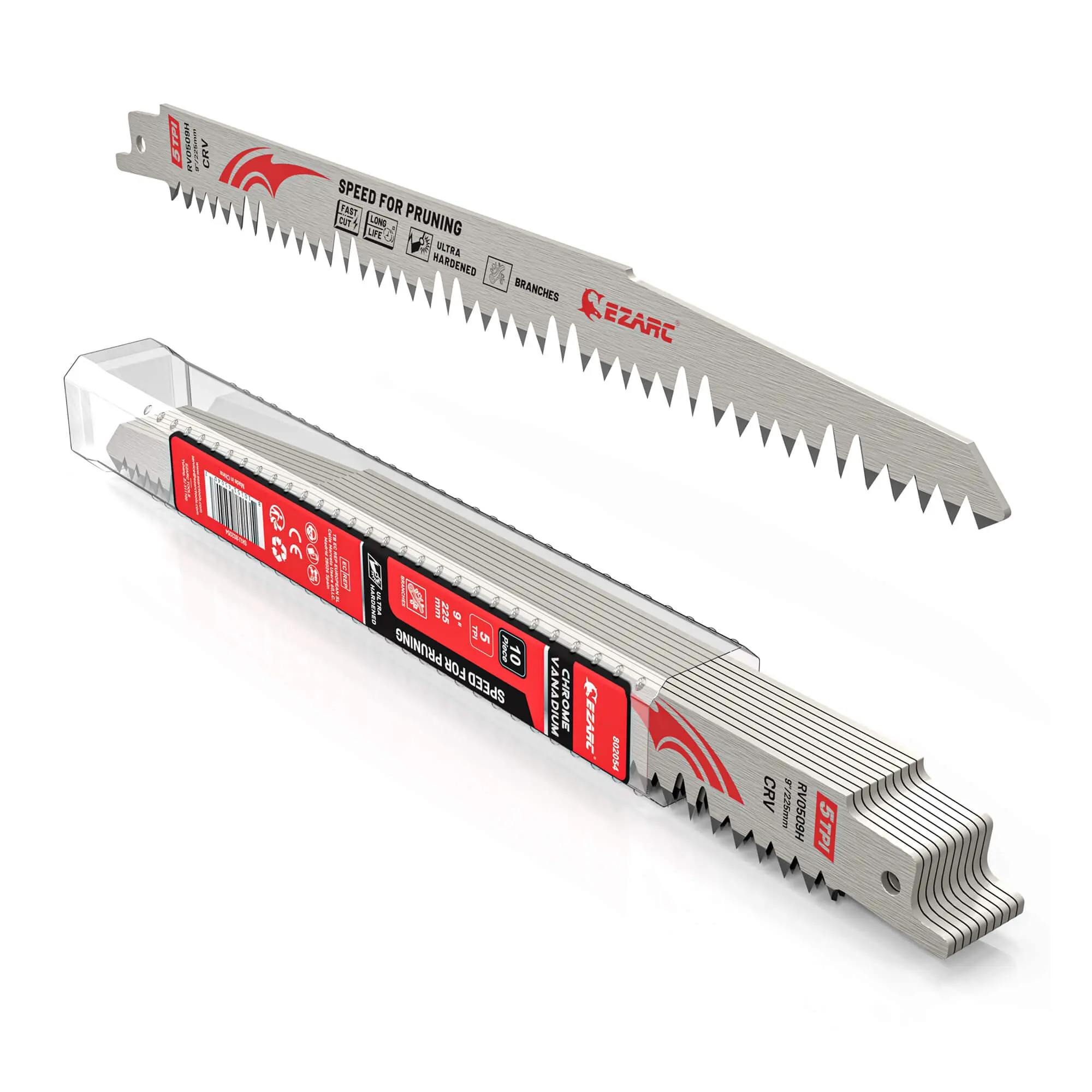 EZARC 9 in. 5 TPI Wood Pruning Reciprocating Saw Blade is made of grey steel and features a staggered tooth pattern that's ideal for pruning.