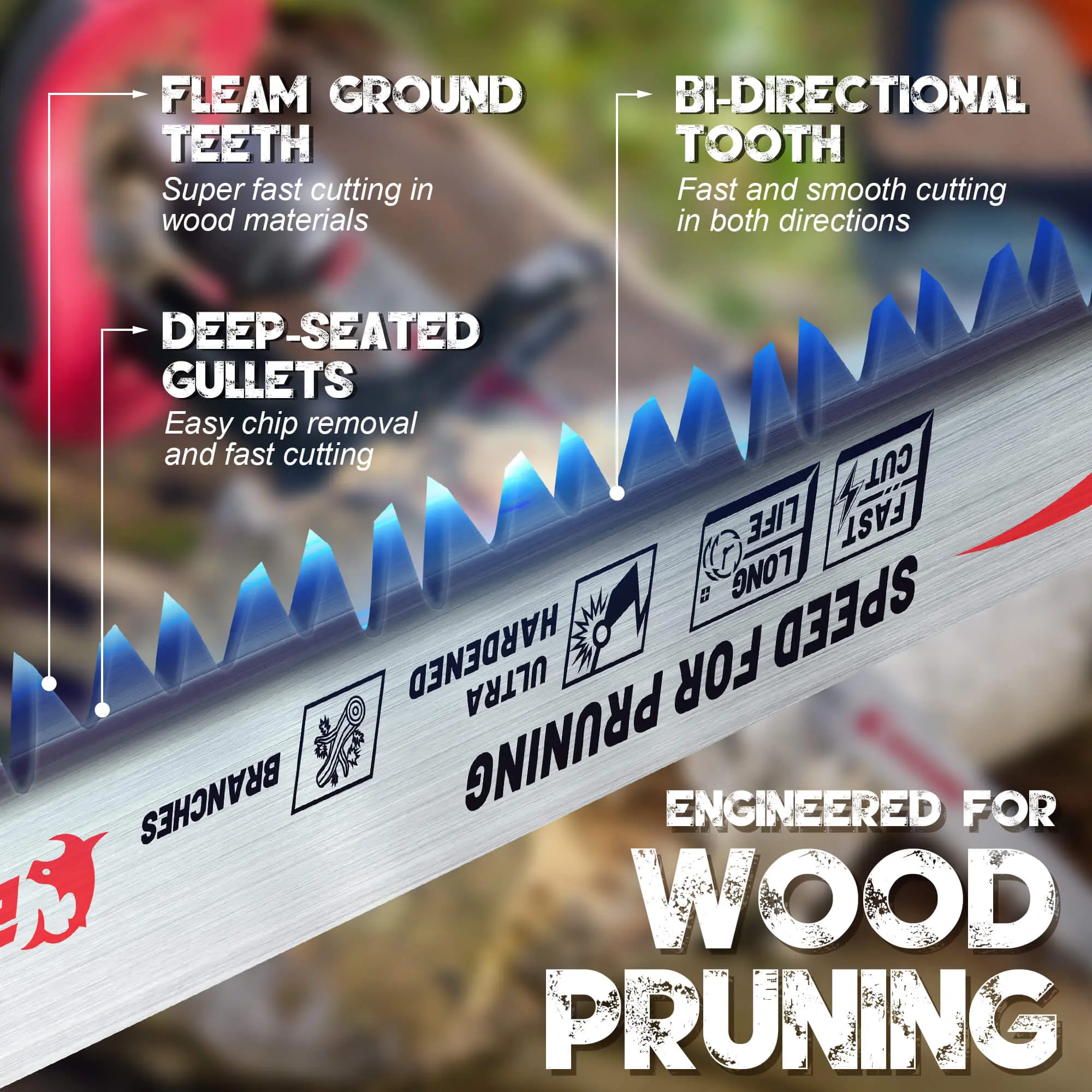 This wood pruning blade features sharp, aggressive fleam-ground teeth and deep gullets for efficient cutting, with a tooth design that ensures a 3x longer lifetime.