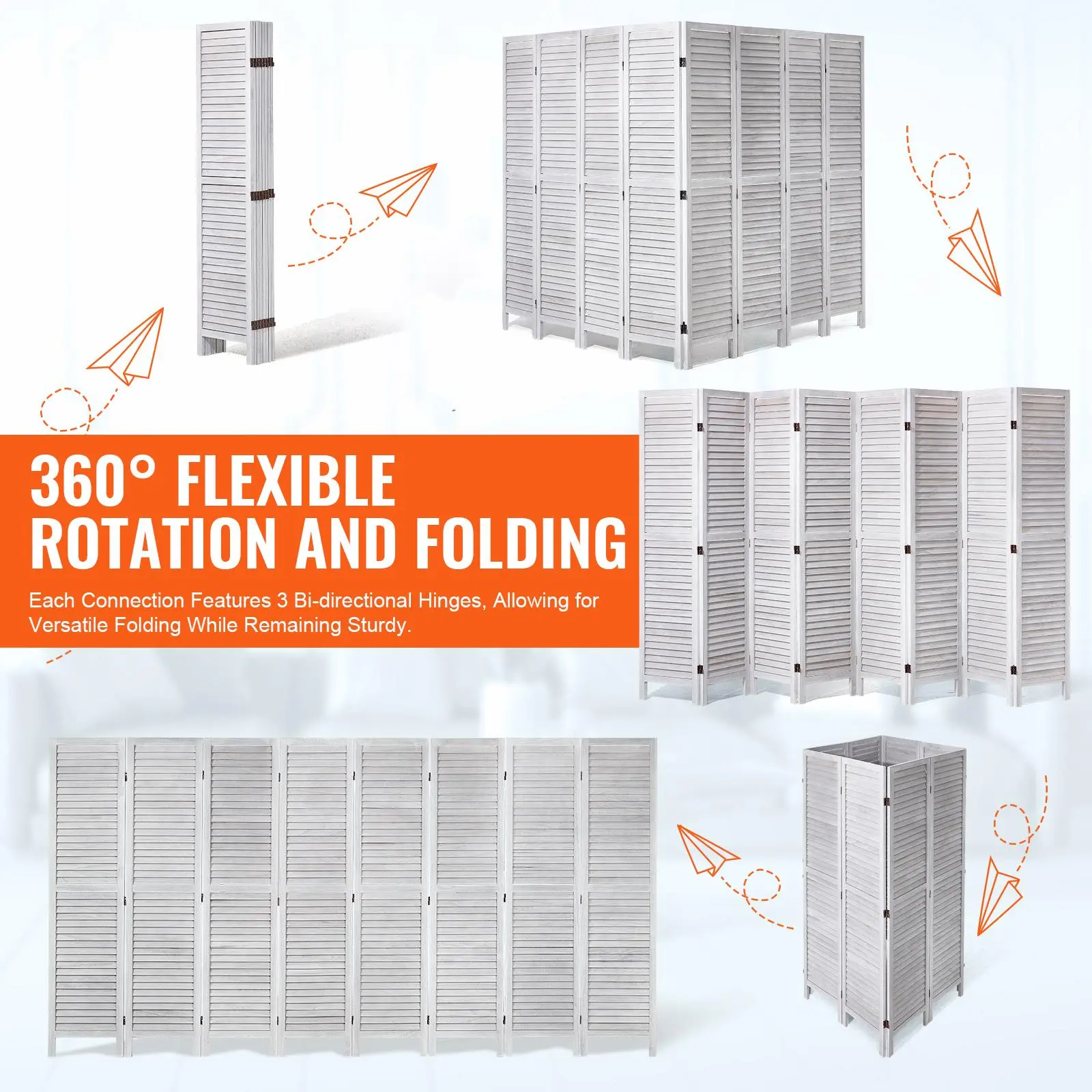 • Flexible 360° Movement: Each room divider panel connects with three sturdy double-directional hinges, allowing you to rotate and fold at any angle. When not using it, fold it and tuck it away in a corner. For added stability, arrange it in a zigzag pattern to keep it from tipping over when fully extended.