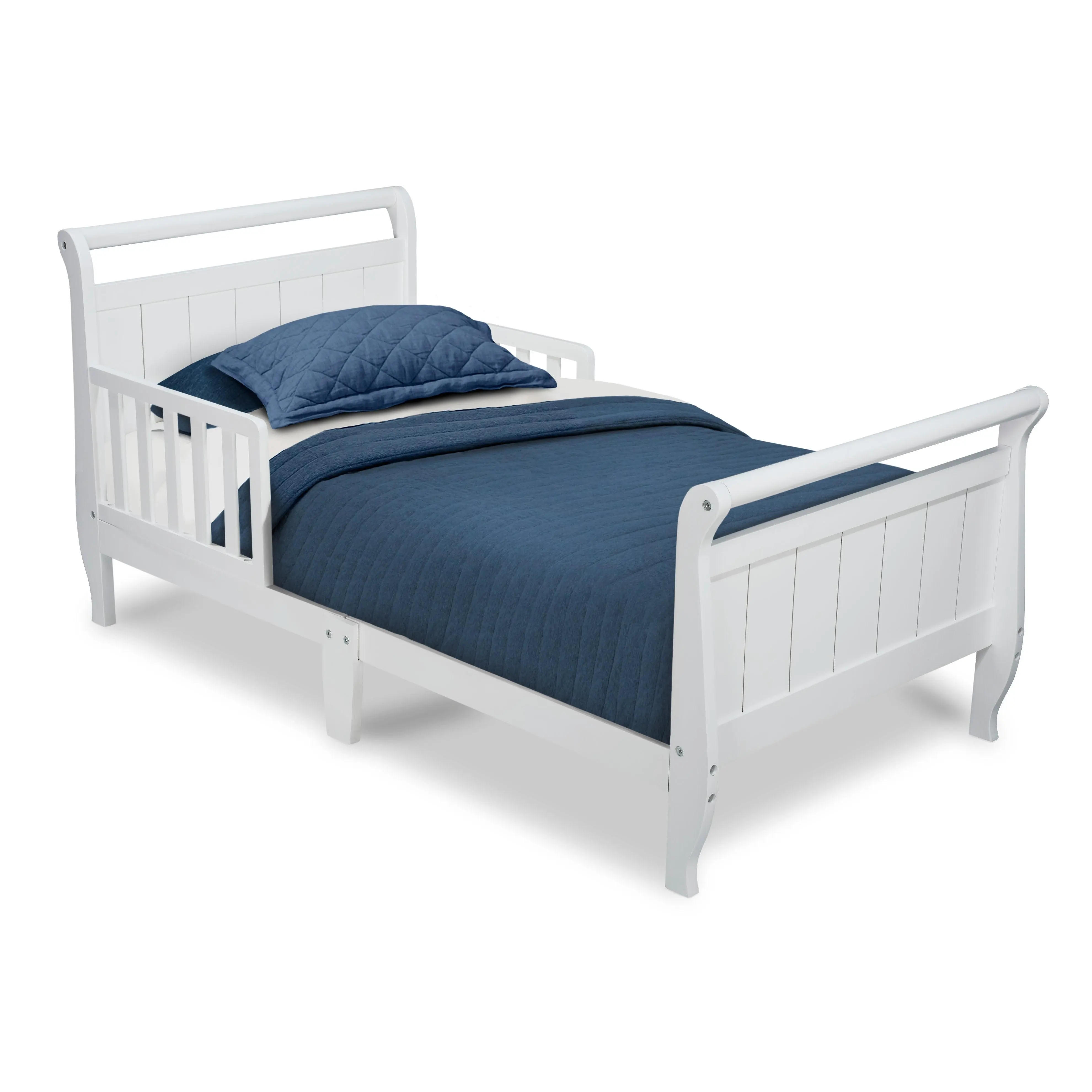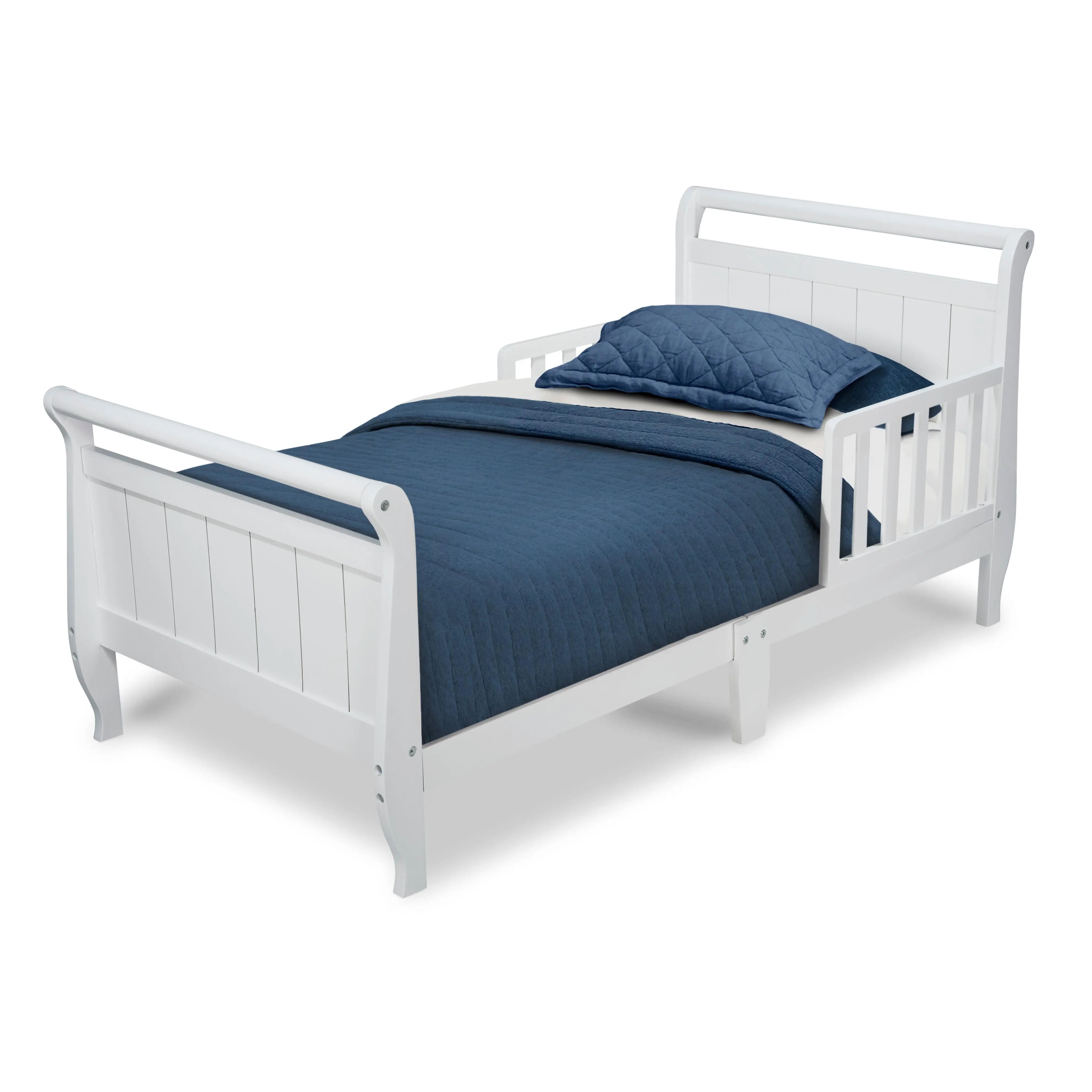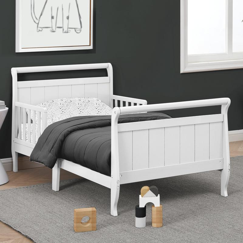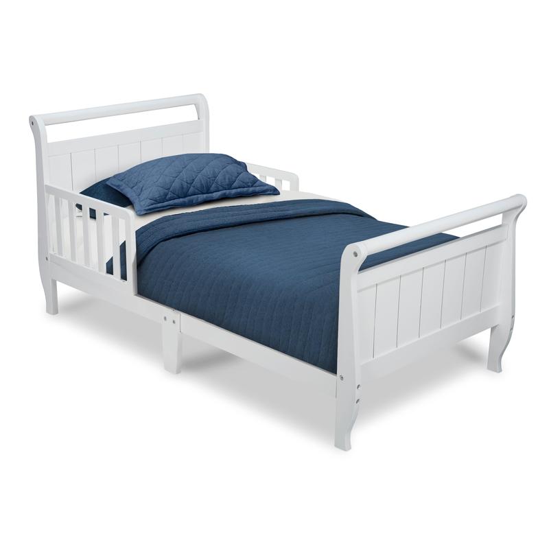 Tuck your little one in for a night of sweet dreams with this Wood Sleigh Toddler Bed by Delta Children. Made from sturdy hardwood, it has an elegant sleigh-style design, bringing a timeless look to any bedroom. Attached guardrails give you added security and keep your little one safe throughout the night. It's the perfect bed for toddlers who have outgrown their cribs and are making the transition to big-kid bed. Bed fits a standard size crib mattress (mattress sold separately). Recommended for ages 15 months+.