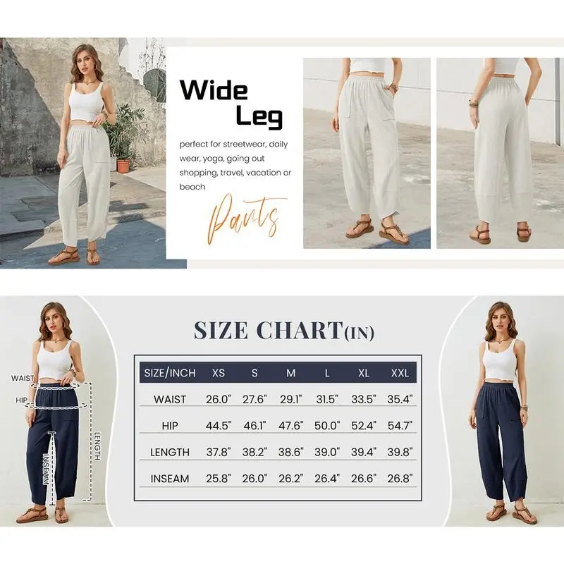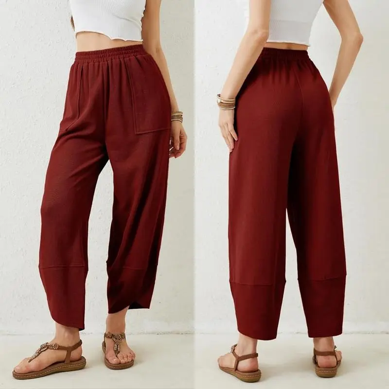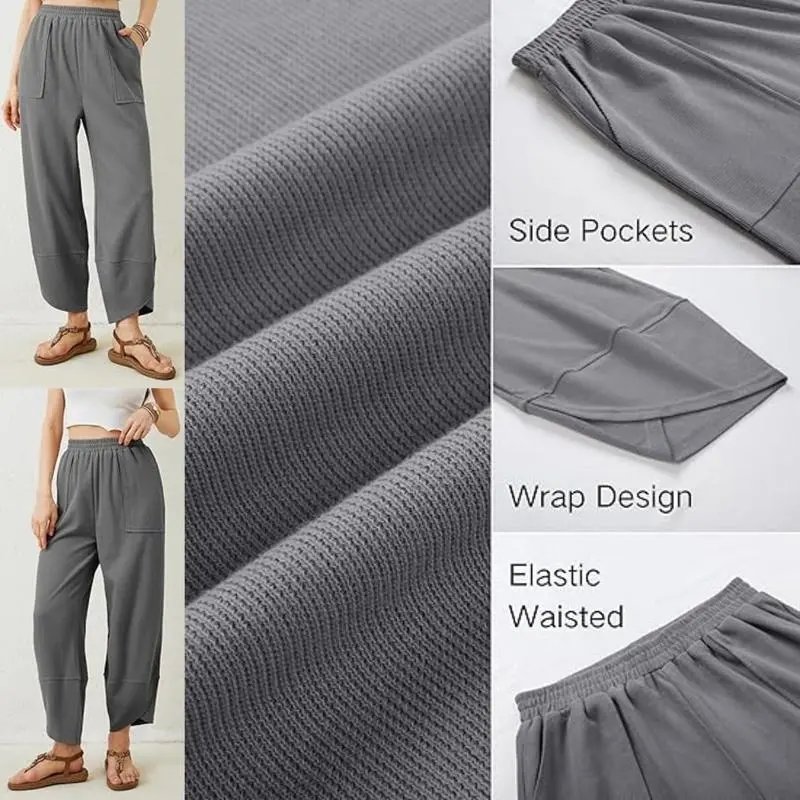 ·Features - Elastic waistband, wrap design at the hem, ankle length, side seamed pockets, and a flowy, loose fit that flatters the figure.