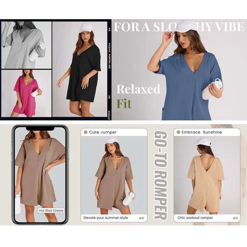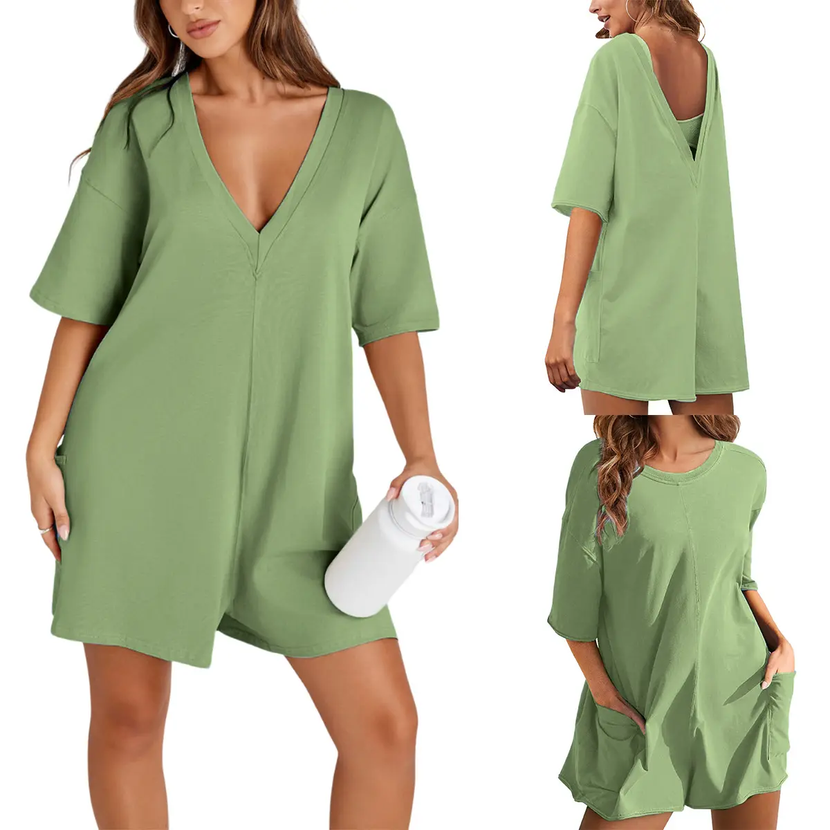 ·Key Features - Womens romper featuring relaxed fit and shapeless silhouette with two big side pockets for convenience, dropped half sleeves jumpsuits, raw hemlines.