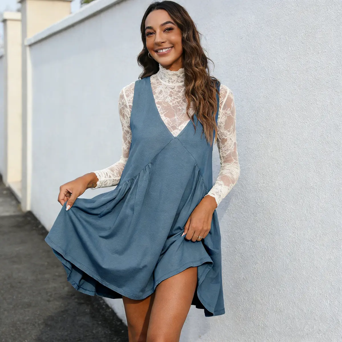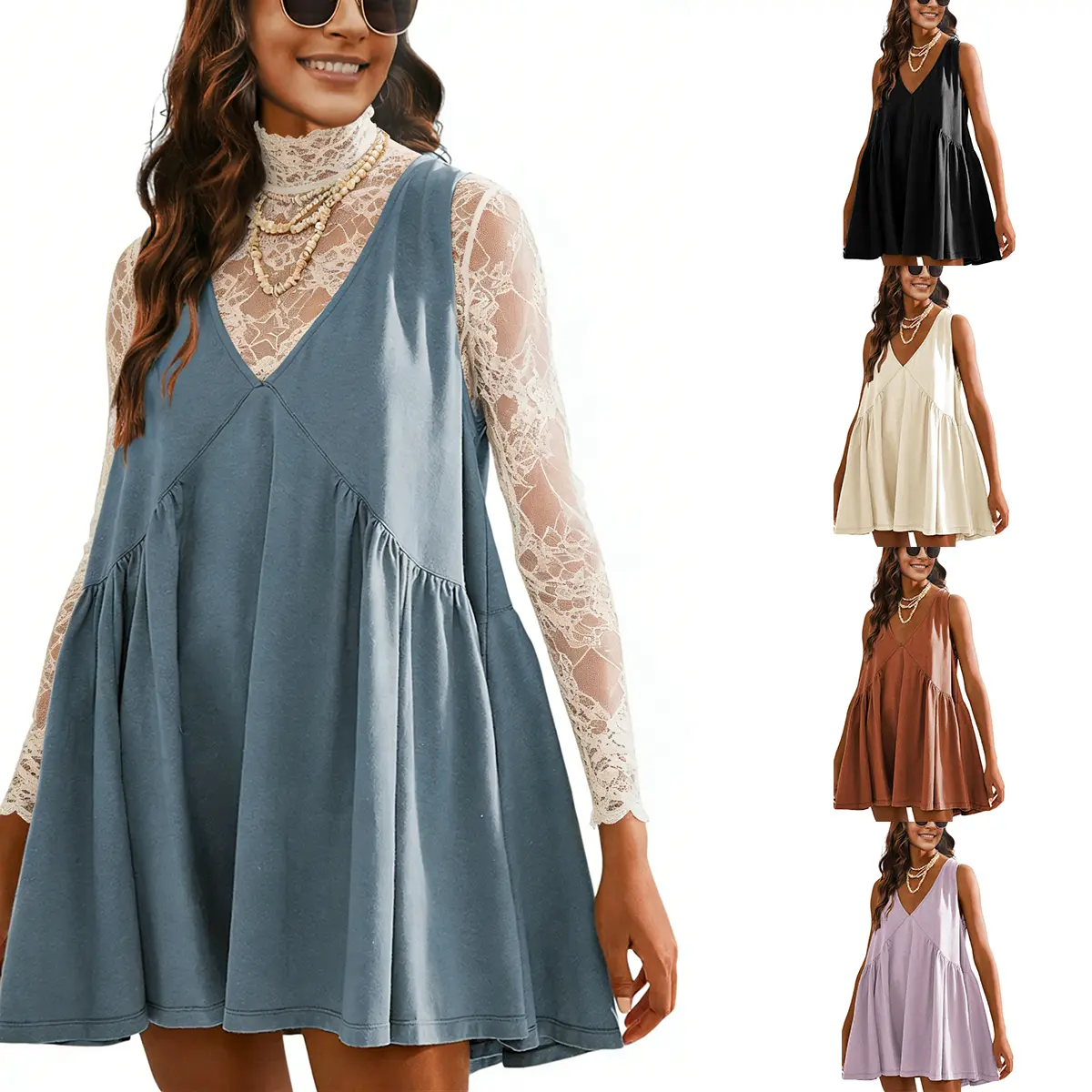 ·Feature: V-neck, dropped armholes, side pockets, relax fit, solid color, casual mini dress that it can be paired with various styles.