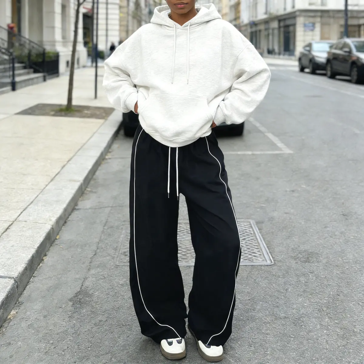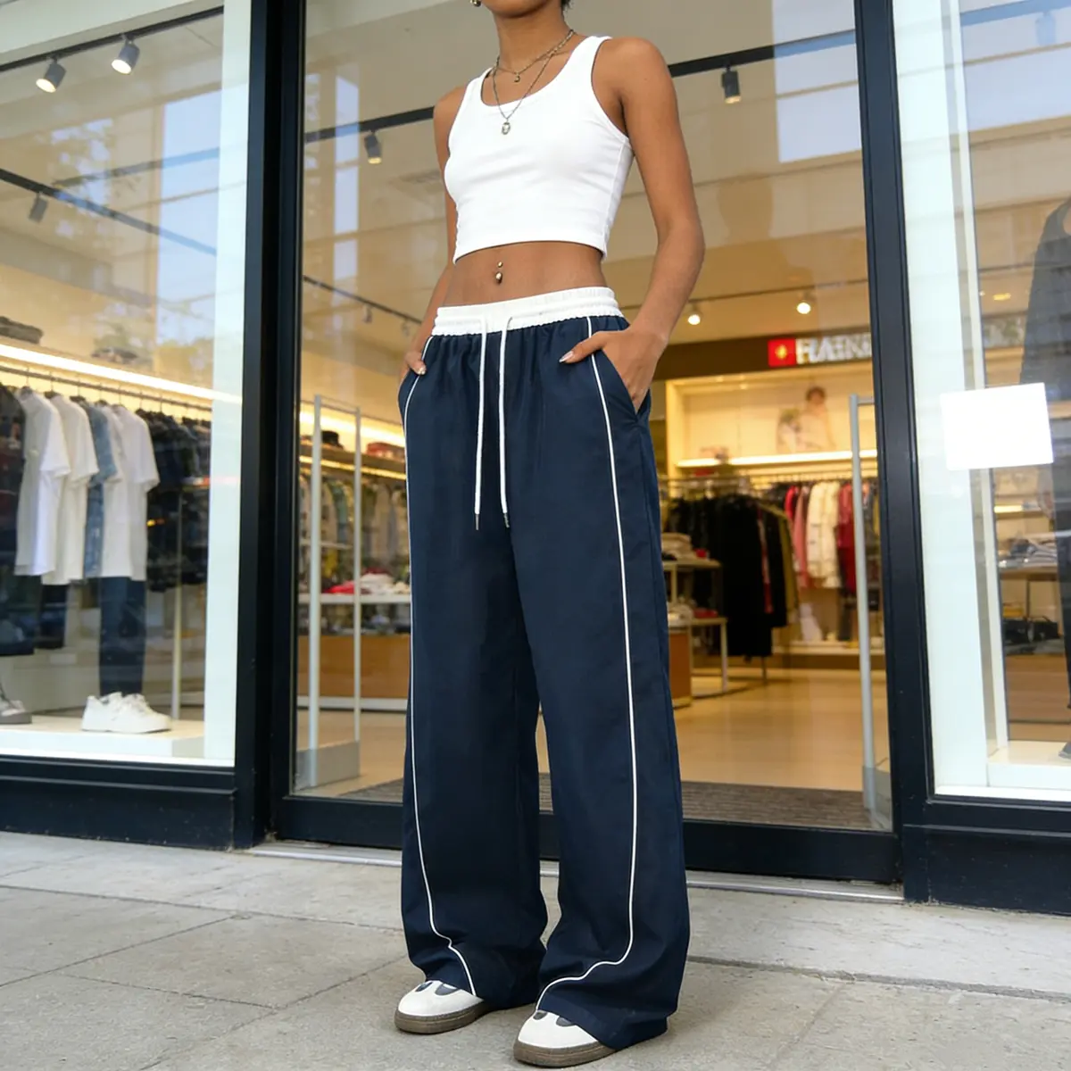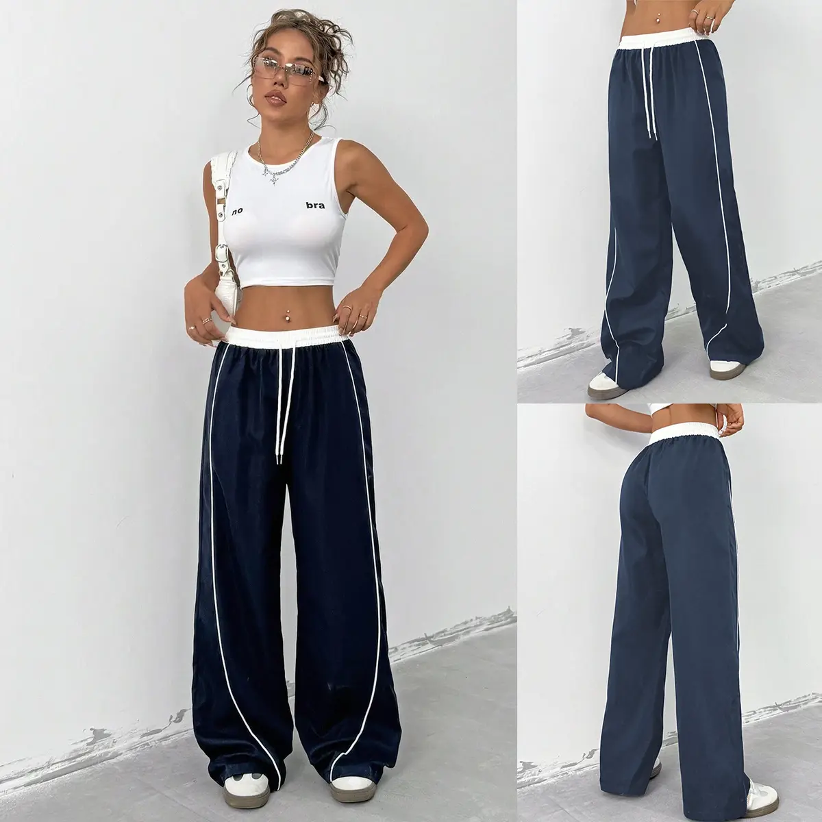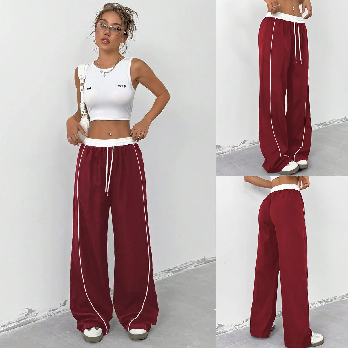 ·Trend-Driven Design - Elevate your streetwear style with high-waisted joggers featuring contrast white stitching and adjustable drawstring waist. The wide-leg track pants design boasts functional side pockets and a flattering silhouette that accentuates curves while ensuring maximum mobility. 🌟