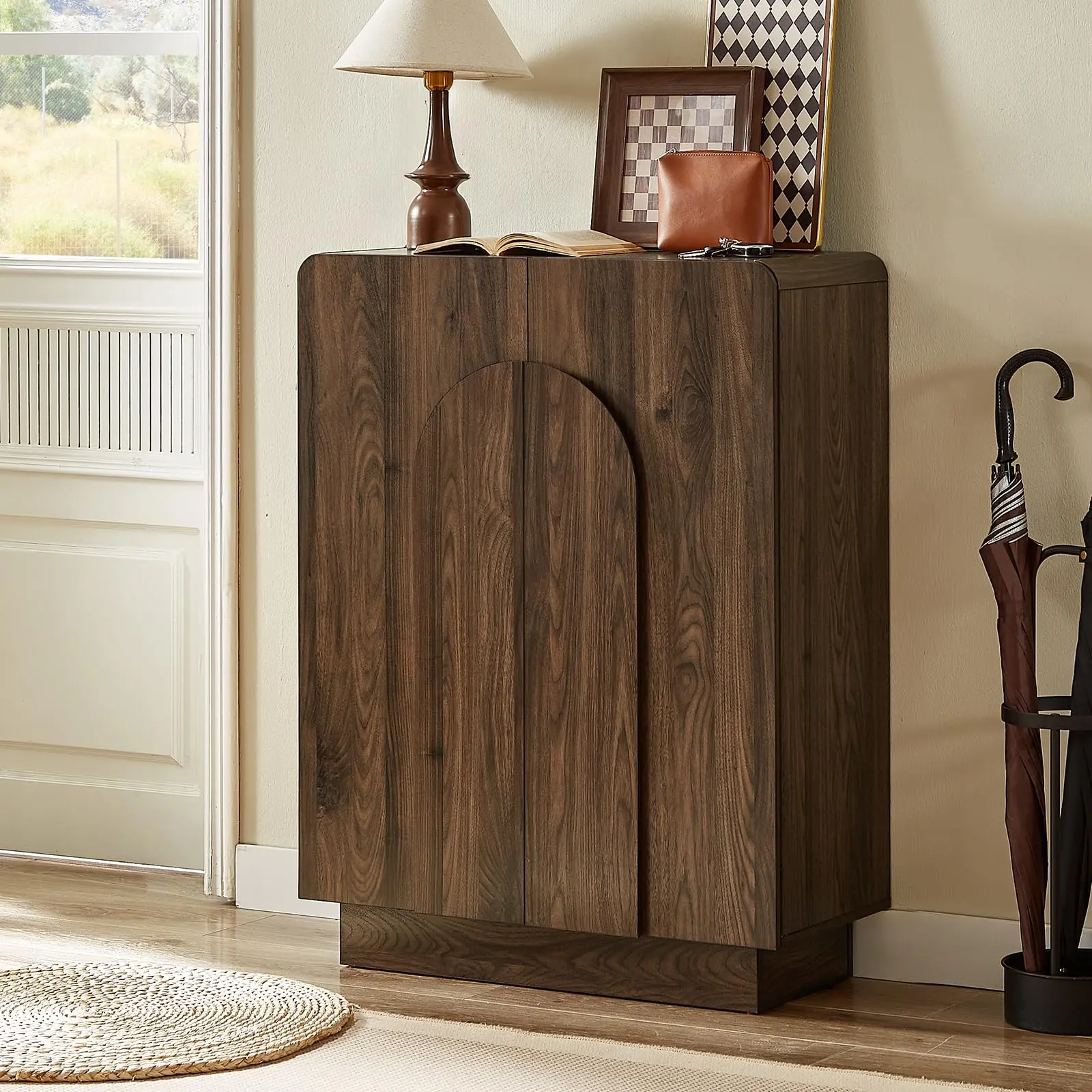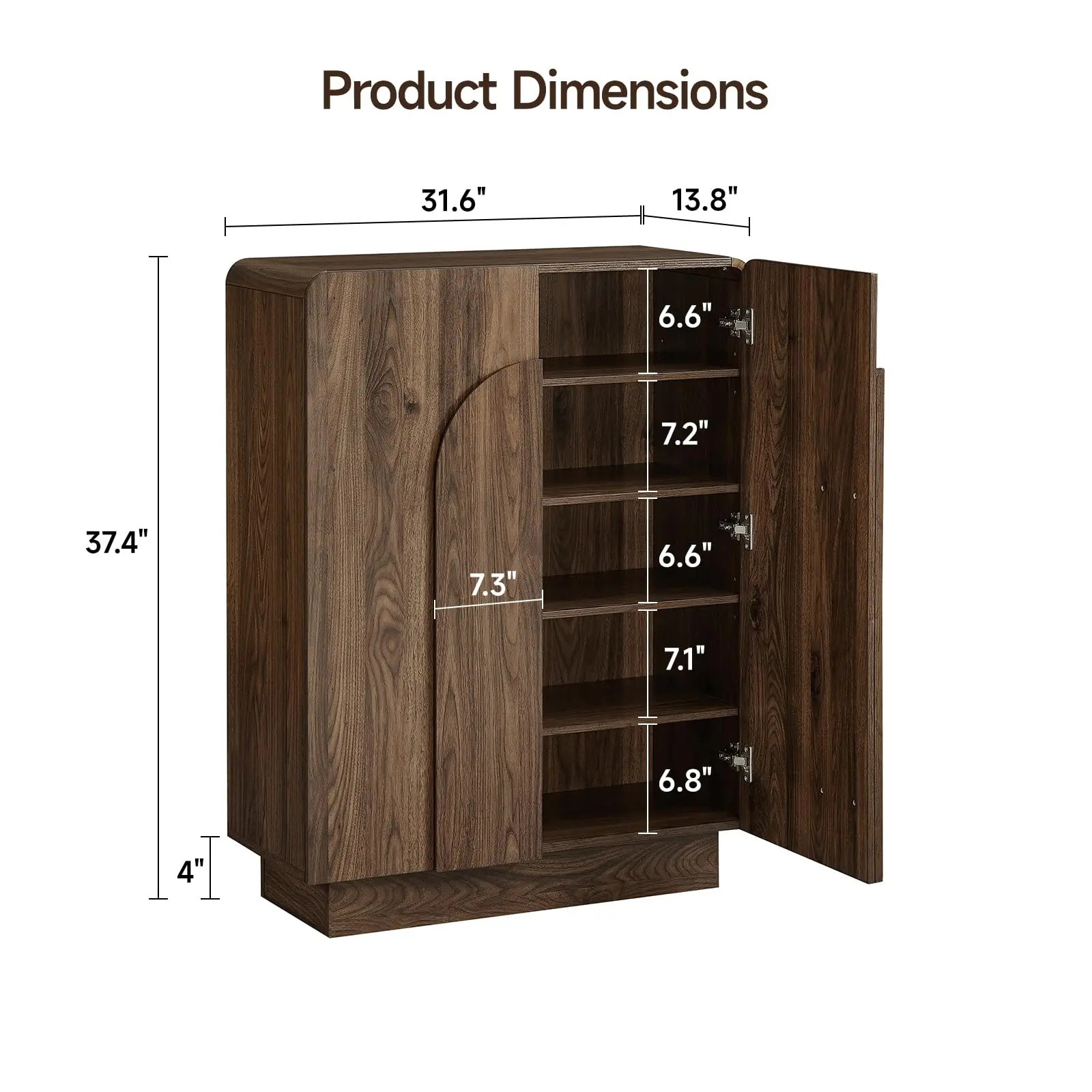 Infuse your entryway with organic texture and California cool style using this arched door shoe cabinet. Expertly crafted from solid wood and featuring a graceful arched hand-carved door, this storage piece adds a touch of boho-modern charm to any space. Beyond taming entryway clutter, its versatile design allows it to serve as a chic console, rustic sideboard, or hall cabinet. With 5 fully adjustable shelves, it can be customized to store everything from sandals to tall boots, combining practical storage with relaxed, welcoming vibes right out of the box.