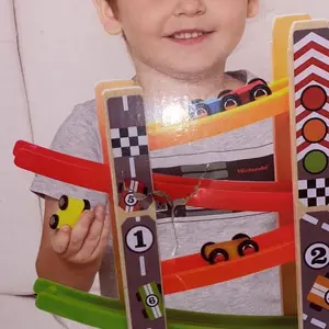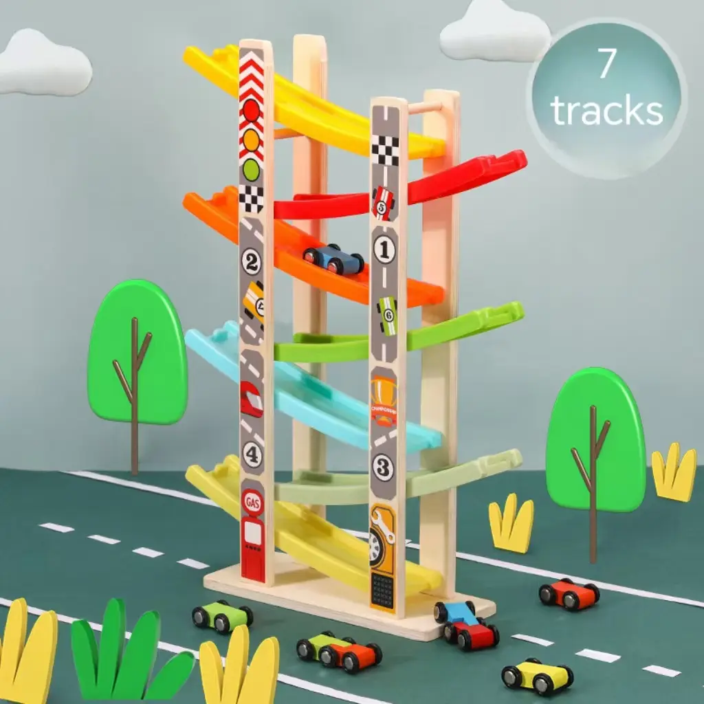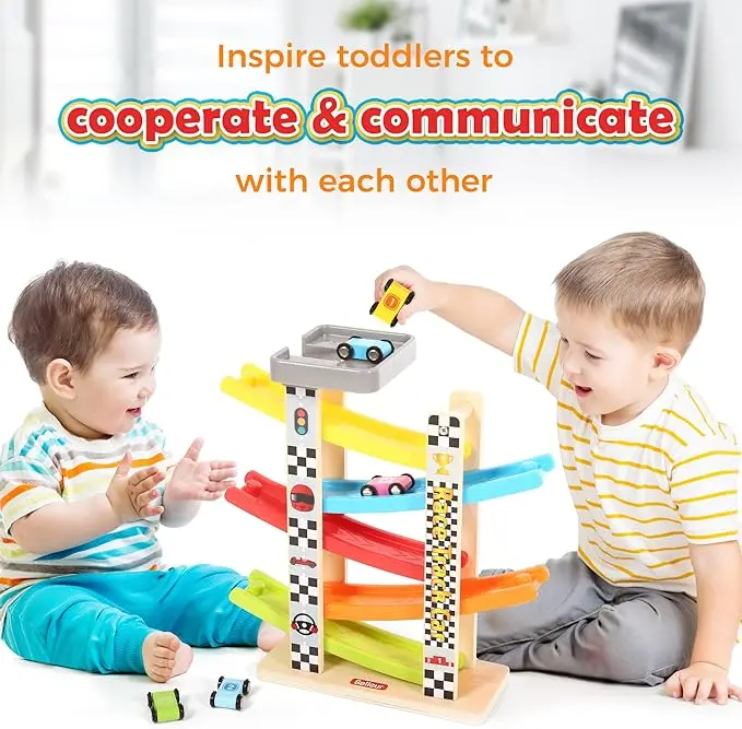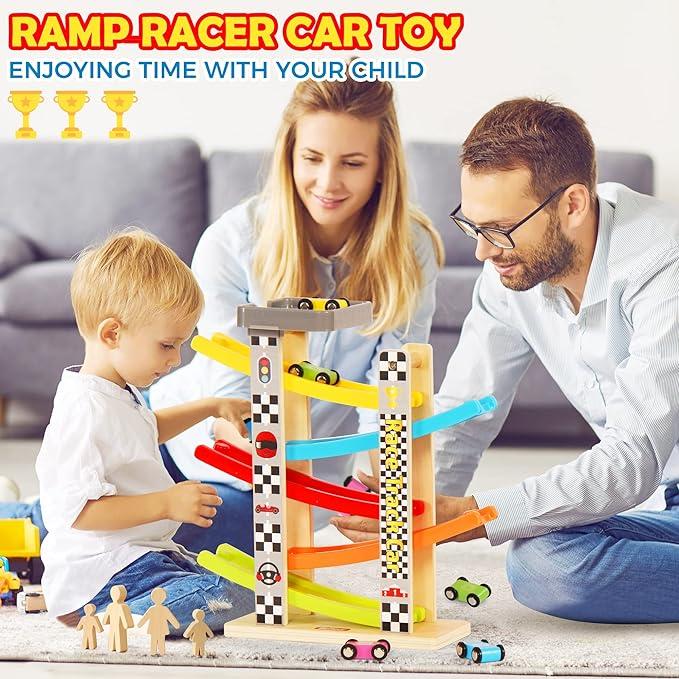 The Toddler Toys, Wooden Car Ramp Racer Toy Vehicle Set is an engaging and educational playset. Inspired by the Montessori teaching philosophy, it encourages toddlers to explore cars, develop fine motor skills, and engage in imaginative play. The set includes colorful, miniature wooden cars and race tracks.