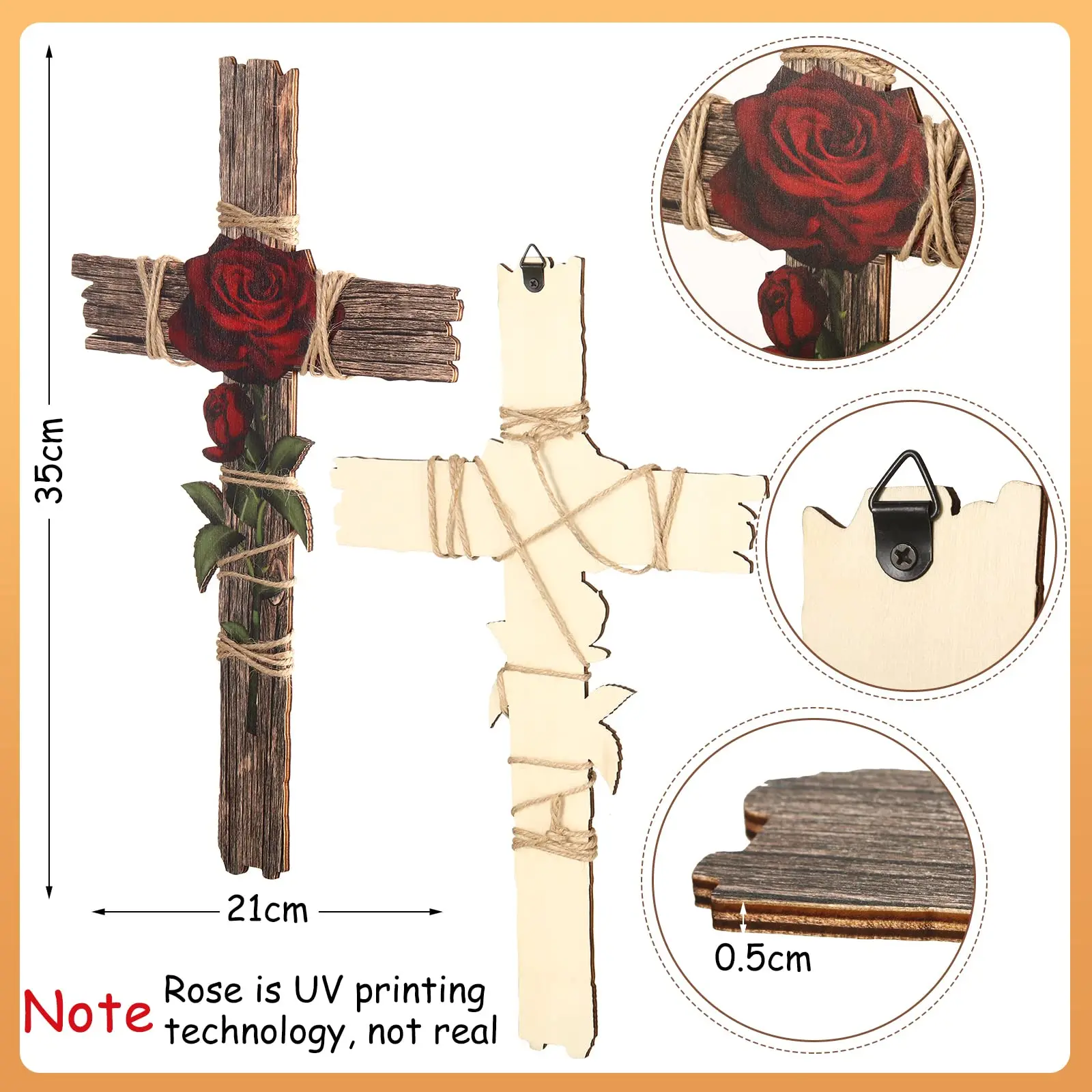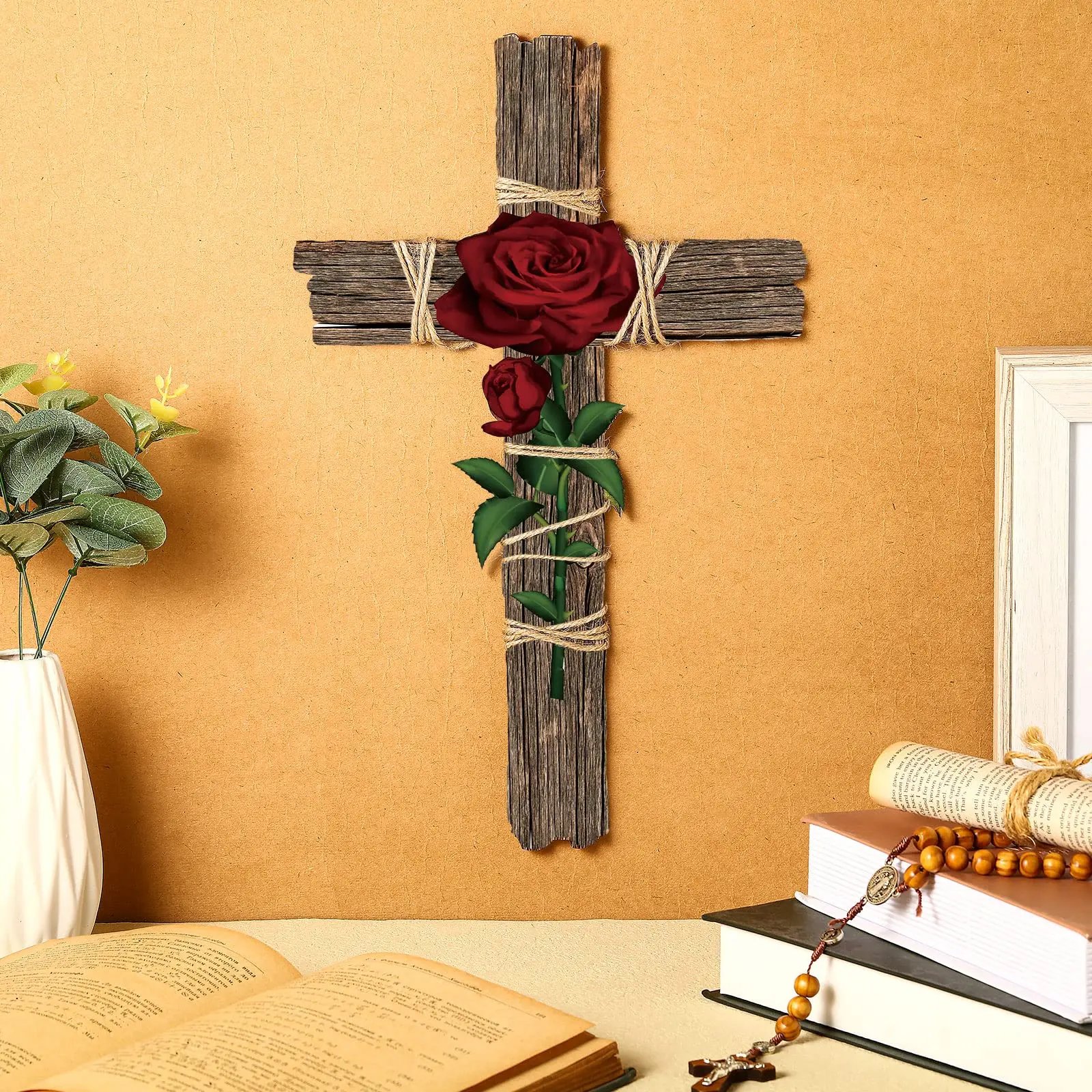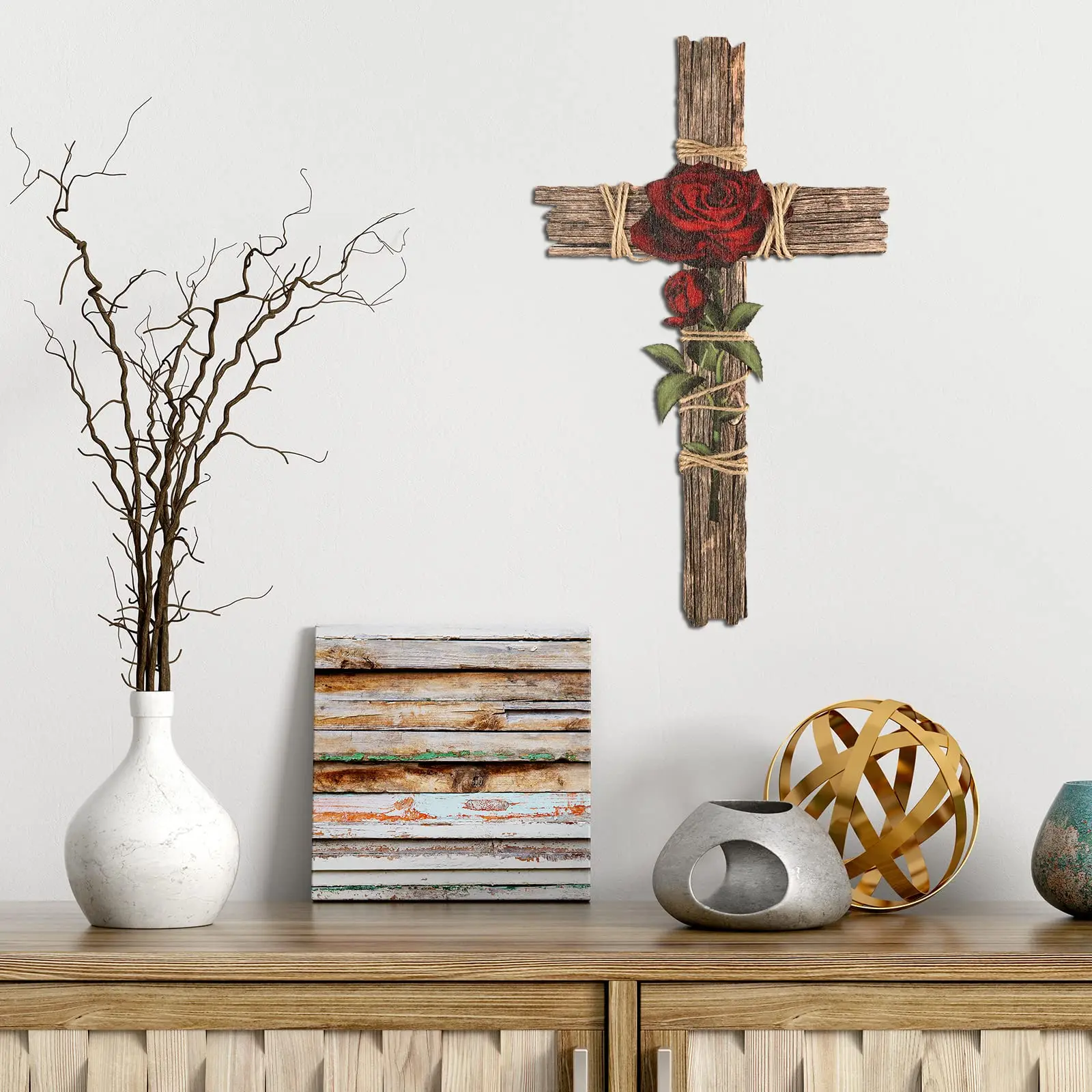 ·Vintage and Rustic Style: hanging wall cross with rope and rose print on a wood grain background, full of energy and charm, simple and elegant, rustic and retro, can help to express your inspiring emotions