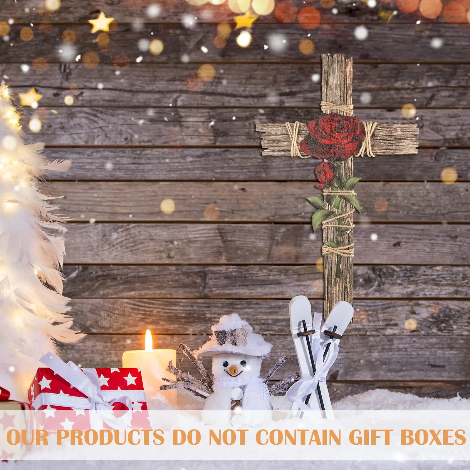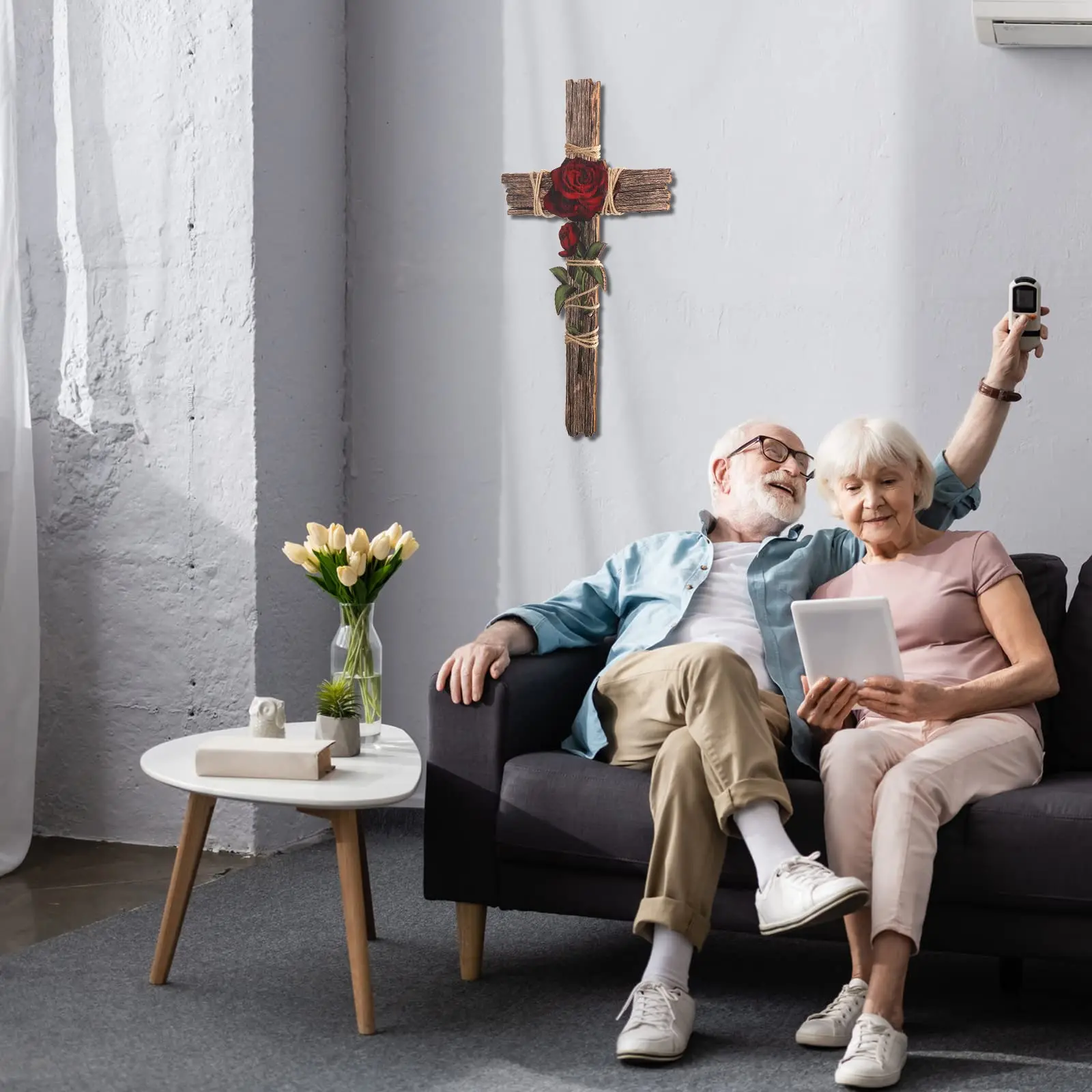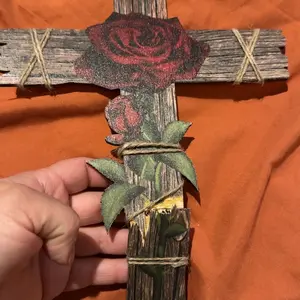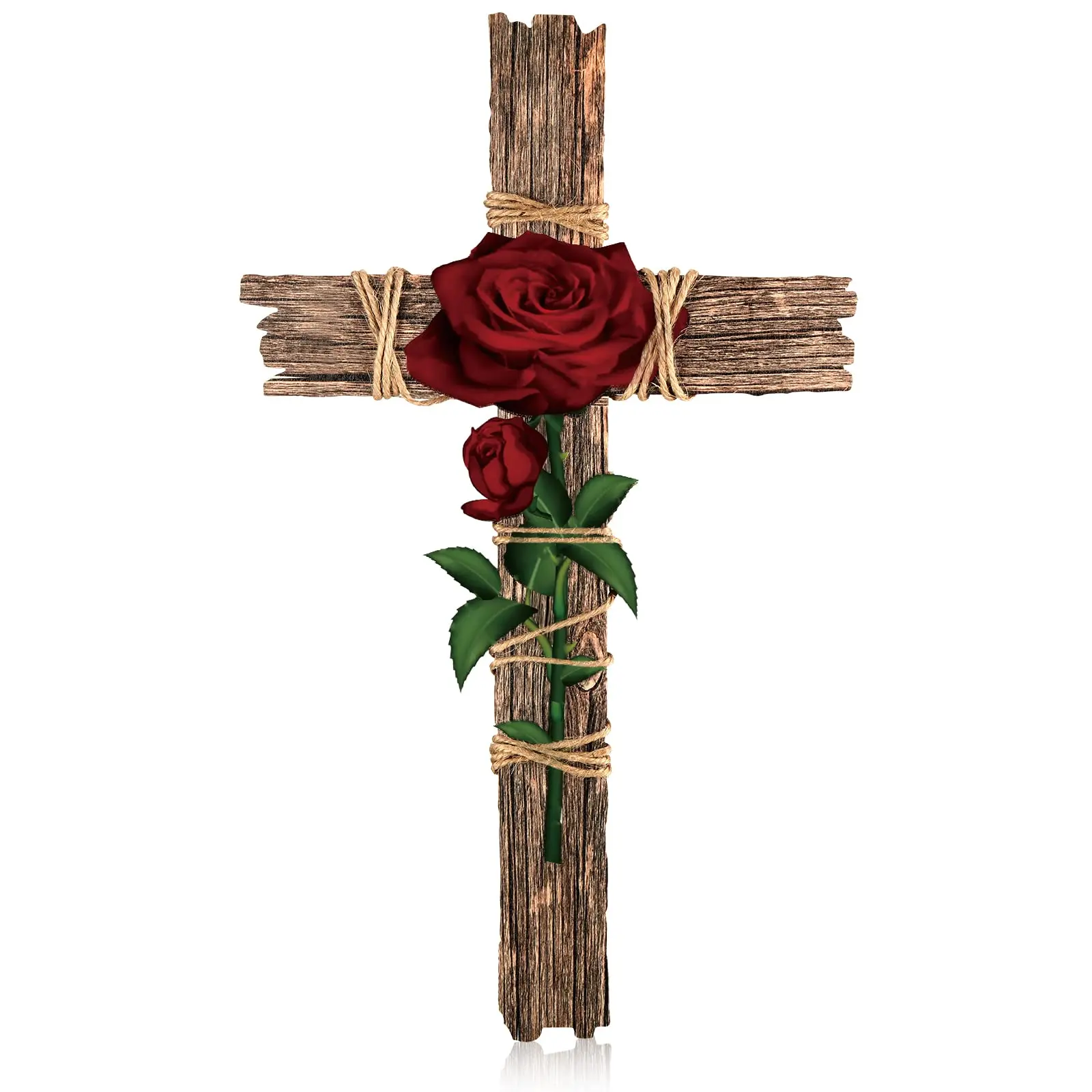 ·Vintage and Rustic Style: hanging wall cross with rope and rose print on a wood grain background, full of energy and charm, simple and elegant, rustic and retro, can help to express your inspiring emotions