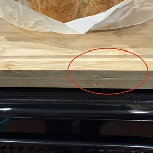 It looked great out of the box. Using it on the glass stove top. I move it when using the oven as the glass gets warm. I haven’t cut on it, or prepped food on it. It feels a bit rough to the touch. Like it needs to be sanded. I also noticed several cracks where the boards are glued together.