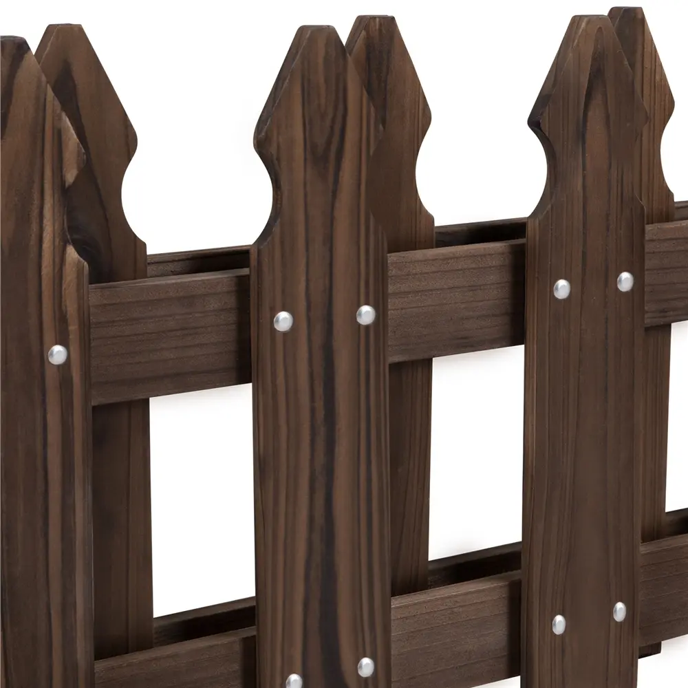 Looking for an easy-to-use rustic picket fence for your flower/vegetable garden? The wood picket fence is made of carbonized & varnished 100% solid fir wood, which is ideal. This picket set includes a total of 177in (14.8ft) of fence and requires little digging for instant use. Our wood garden fence will provide beauty and safety to your garden for years to come.