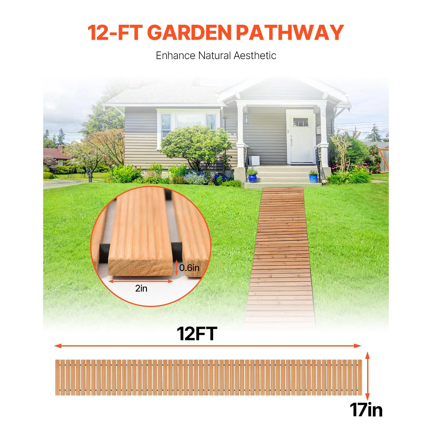 • Aesthetic Appeal: This wooden garden pathway measures 144 inches long and 17 inches wide, enhancing the visual attractiveness of any outdoor space while keeping your shoes clean and dust-free.