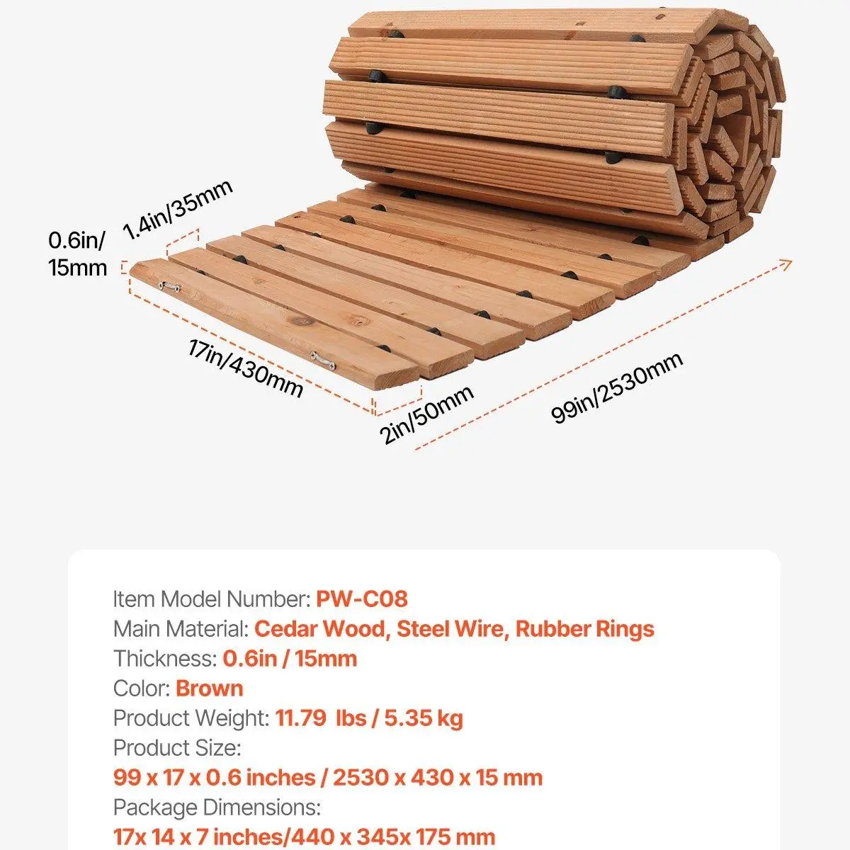 5. VEVOR Wooden Garden Pathway, TikTokShopBlackFriday, 8 ft x 17 in, Non-Slip Curved Garden Walkway, Roll Out Cedar Outdoor Walkway Path with Wire Rope Connection, Decorative Lawn Paver for Backyard Boardwalk Wedding Party
