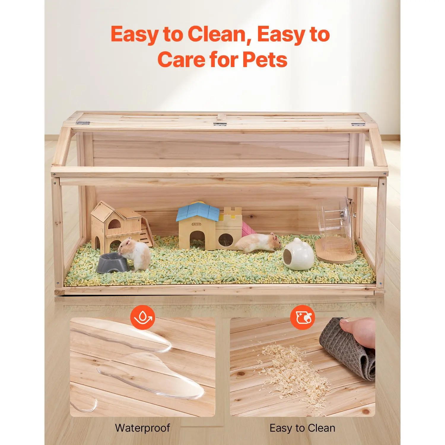 • Visual Enjoyment: Featuring transparent acrylic panels and a large viewing window, this wooden hamster cage allows pet owners to observe their hamster’s activities at any time, adding to the joy of having a pet.
