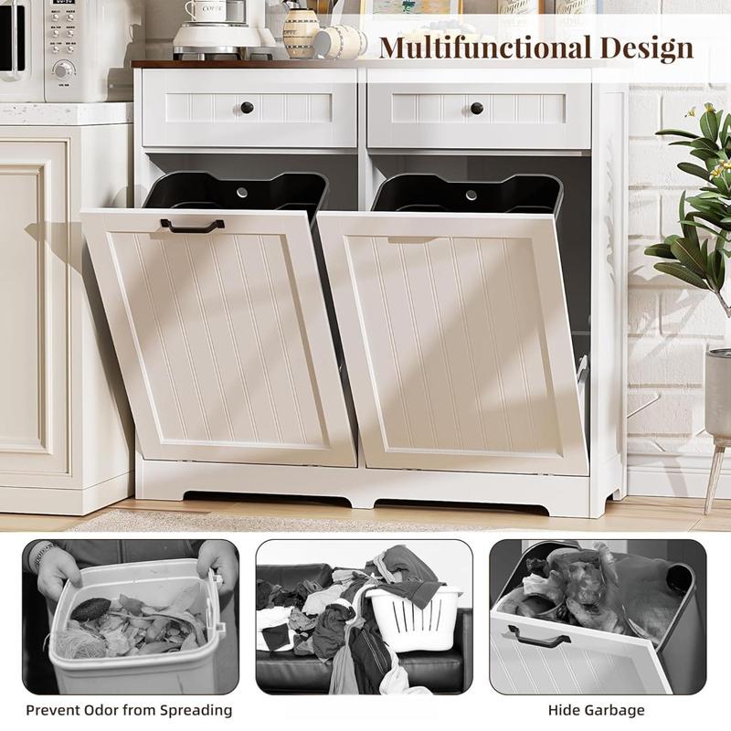 ·Modern Trash Cabinet: Tilt out trash cabinet is simple and practical, it can easily blend into a variety of decor styles. Perfect for placement in various settings such as the kitchen, bedroom, laundry room, living room, and more. Not only can it hold trash cans, but it can also accommodate laundry baskets or store daily necessities.(trash bins not included with this product)