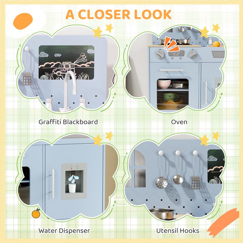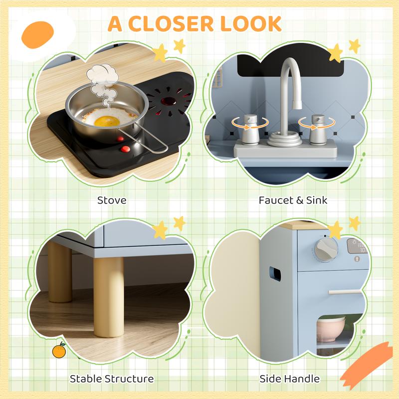 ·AMPLE STORAGE & FUNCTIONAL DESIGN: Toddler kitchen features a sound-and-light stove with clicking knobs, water dispenser, faucet, six-piece cookware set, and chalkboard for immersive pretend cooking. Includes generous storage like a cabinet and space behind the dispenser to keep all toys organized for endless fun