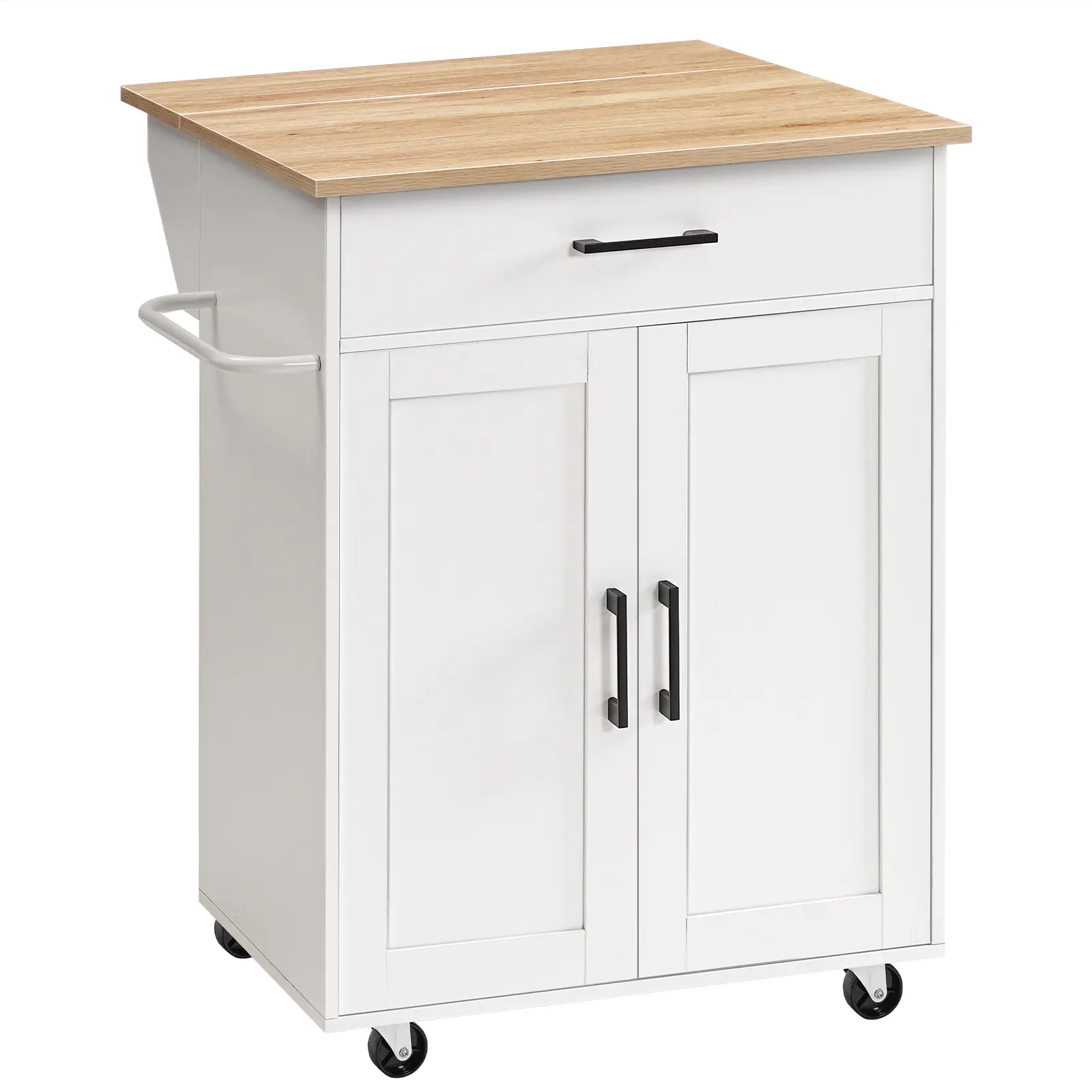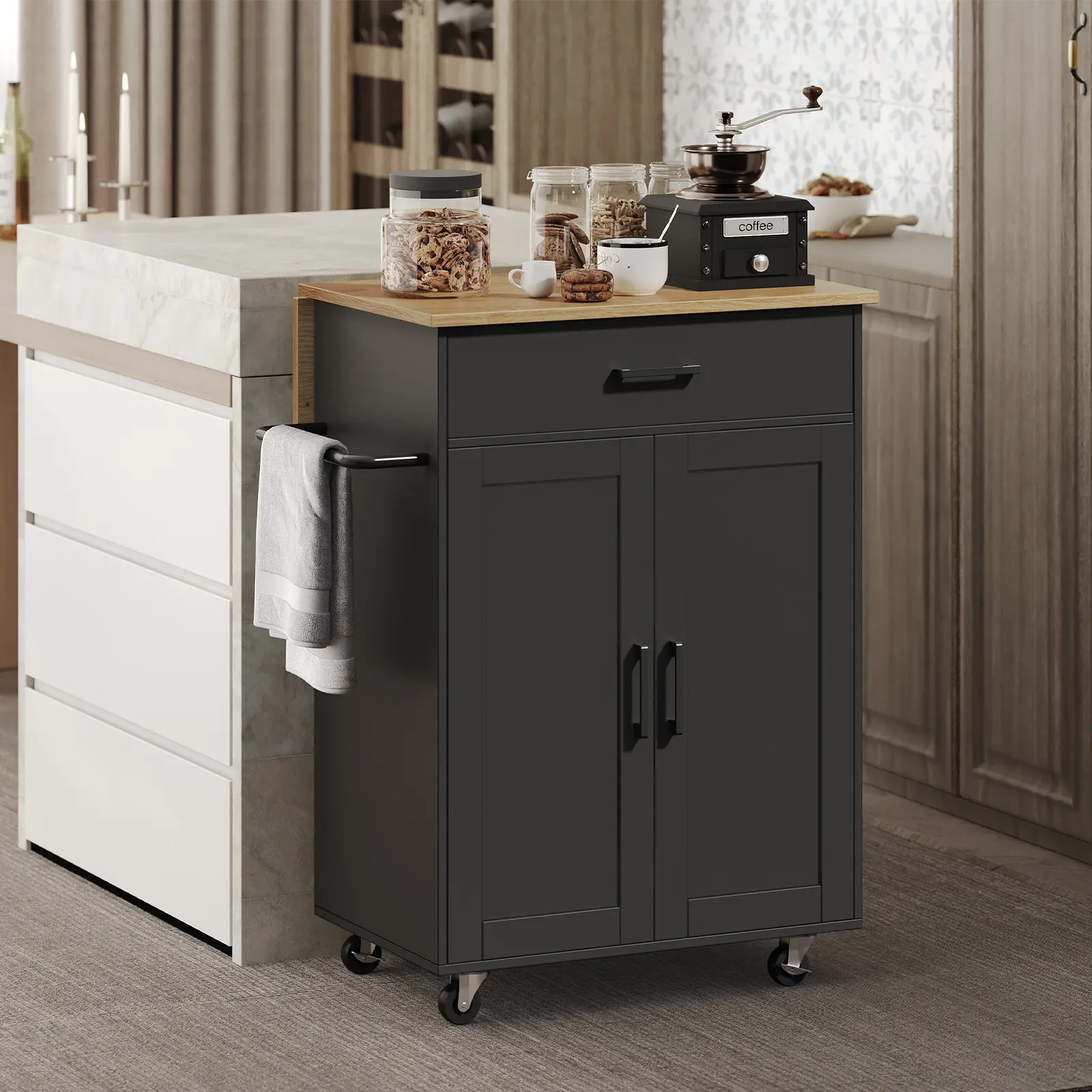 ·Spacious Storage: The kitchen island features a generous countertop with a large drawer and an adjustable shelf, plus a towel bar, keeping your kitchen organized and your utensils easily accessible, whether it's for beverages, cutlery, and more