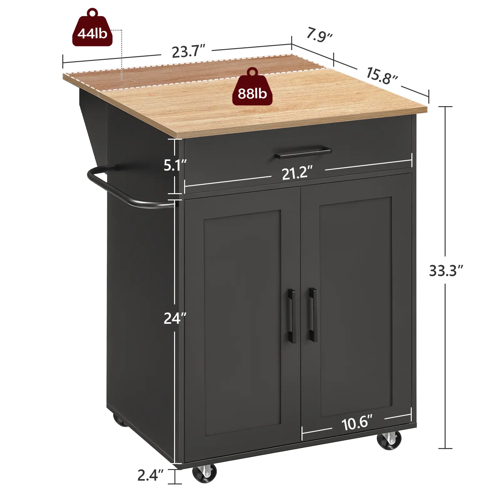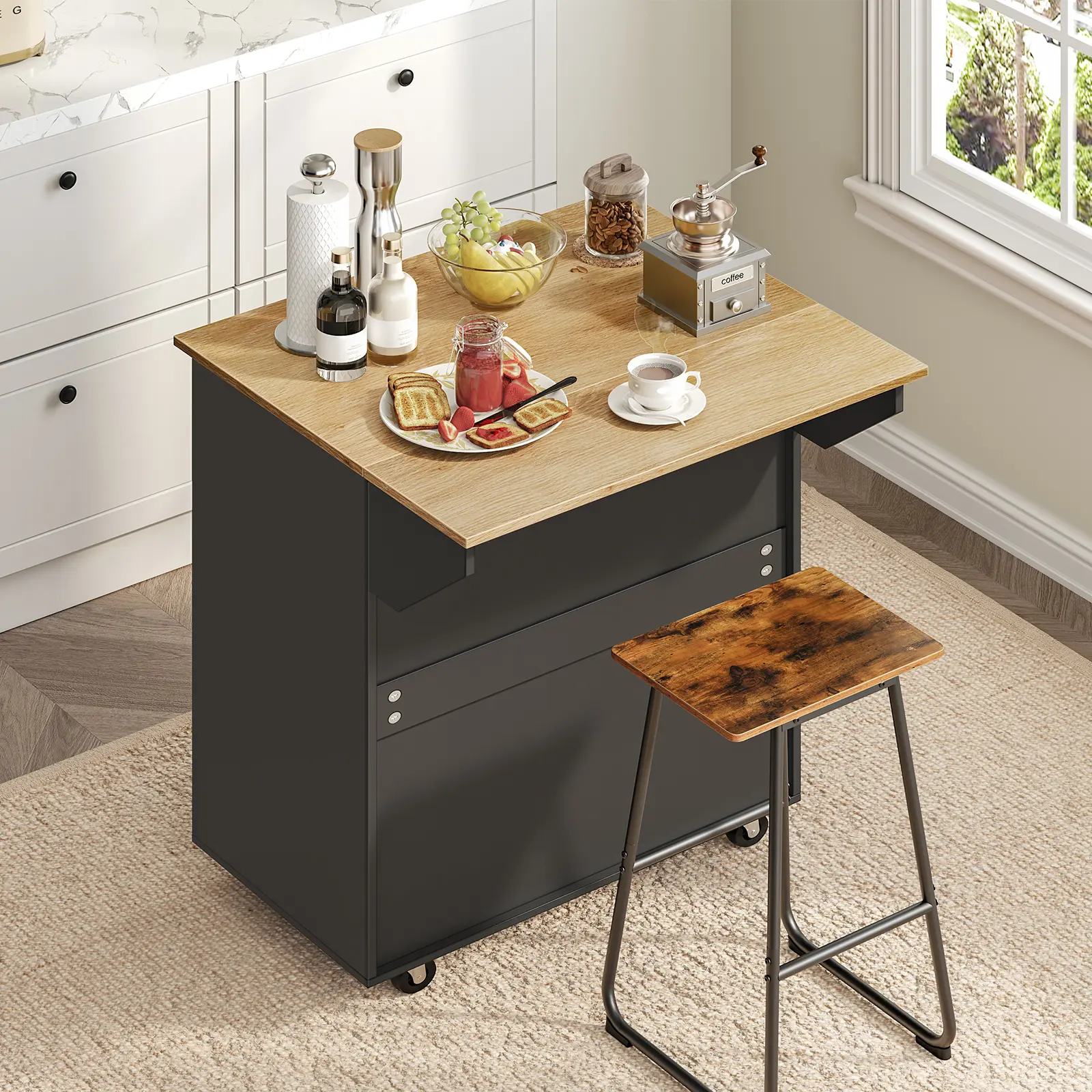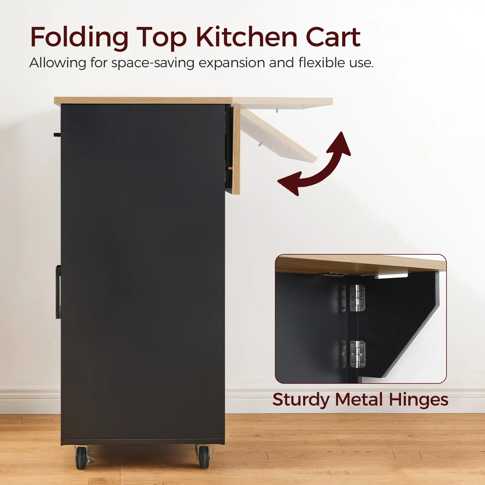·Foldable Kitchen Counter: This kitchen island's innovative foldable top effortlessly unfolds into 23.7"L x 23.7"W and stands 33" high. The top can easily fold away to save space when not in use, offering flexibility in any kitchen layout