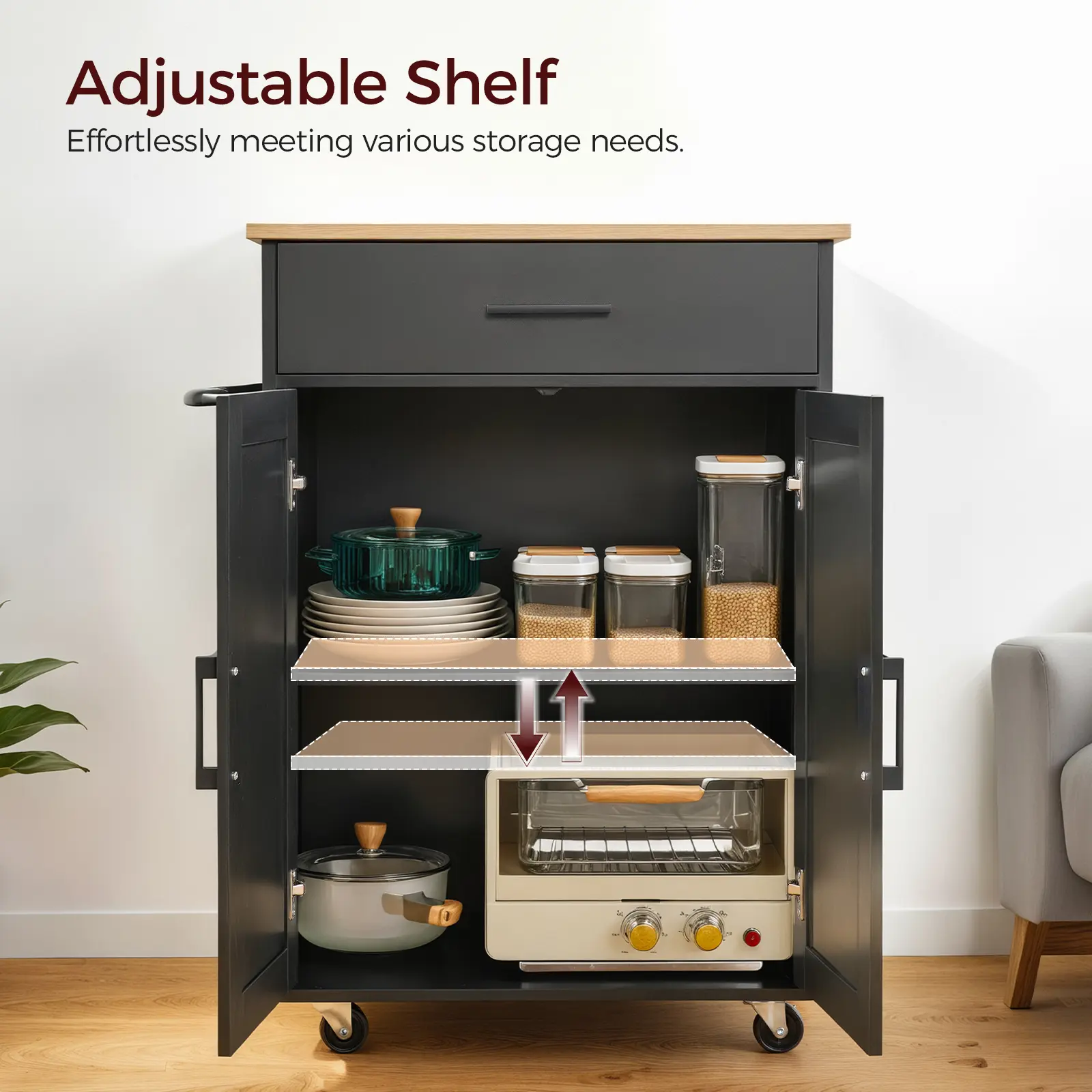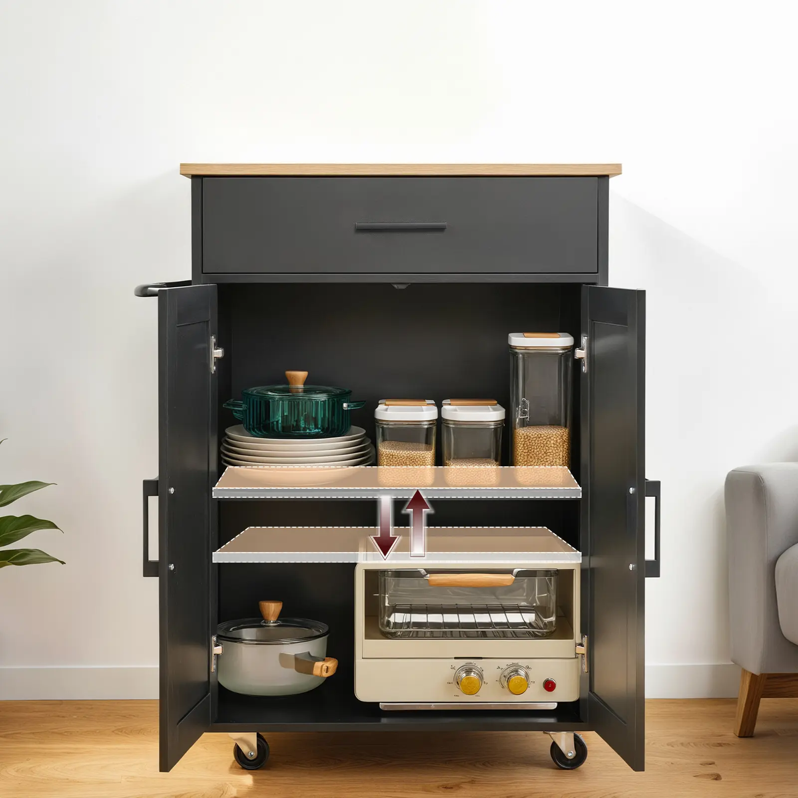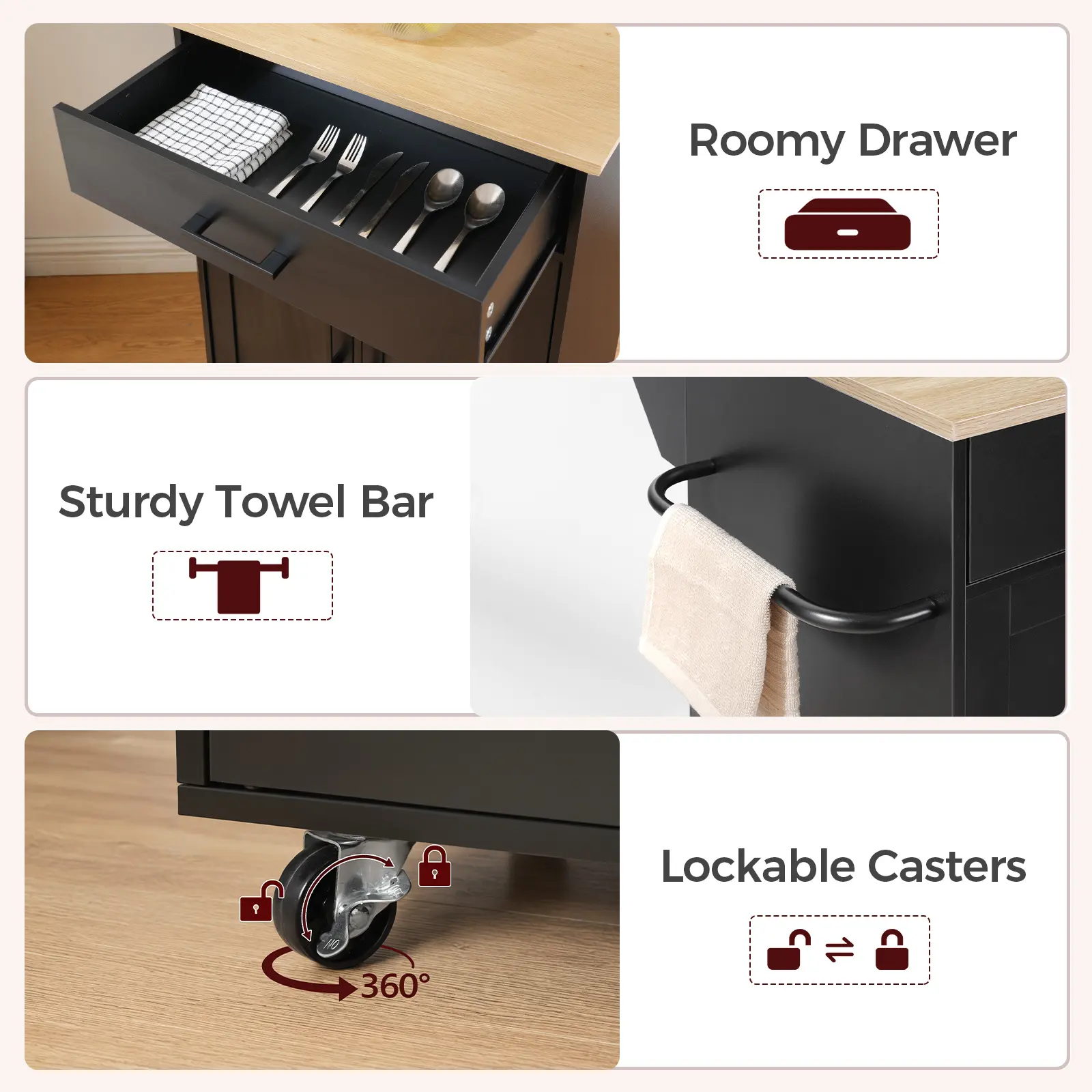 ·Mobile Kitchen Cart: With four premium wheels, this kitchen cart offers 360° smooth rotation for effortless movement, is silent, and is carpet-friendly. With two diagonal locking casters, it ensures stable parking, making kitchen tasks efficient
