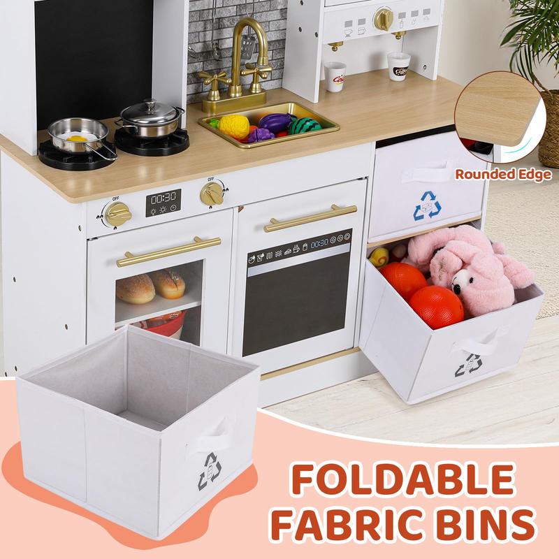 MORE STORAGE SPACE: Simulated play kitchen has multiple storage spaces. 2 fabric bins can be placed in compartments or used individually. Cabinet with 2 doors can be closed to store kitchen toys and avoid dusty stains. Hook storage bar to help organize cookware.